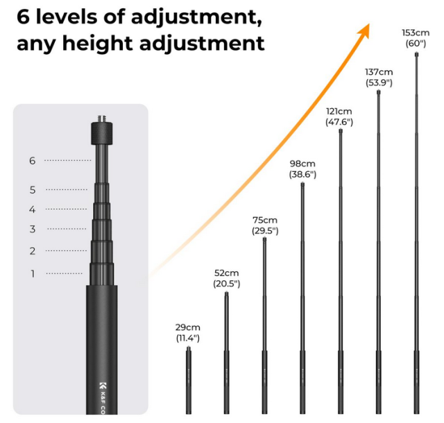 K&F MS07 je univerzální 60'' extra dlouhá prodlužovací tyč, ideální pro snadné pořizování panoramatických záběrů a vzdálených detailních záběrů. Tato selfie tyč je určena pro profesionální fotografy i amatéry a zajistí, že váš prostor pro fotografování již nebude omezen. Její konstrukce z vysoce kvalitní hliníkové slitiny zaručuje odolnost, zatímco 1/4palcový konektor na základně umožňuje snadnou montáž na stojan. Konstrukce napínací trubice poskytuje pevnou oporu a stabilitu a silikonová rukojeť zajišťuje pohodlné uchopení během používání.