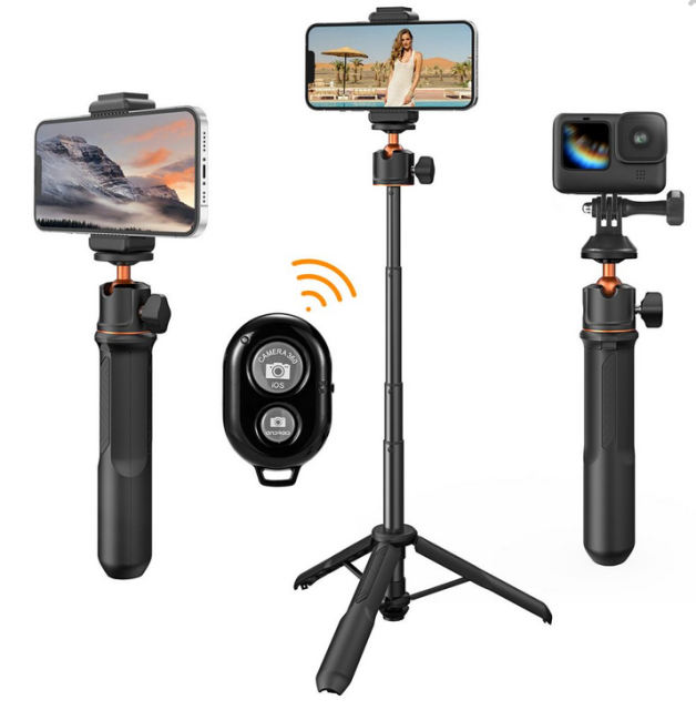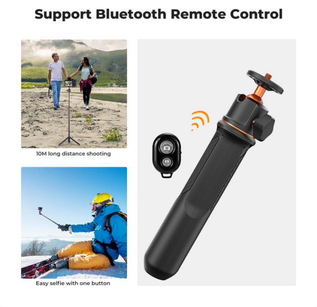 Stativ K&F MS11 je všestranné a lehké řešení určené pro uživatele mobilních telefonů a akčních kamer. Je vybaven svorkou pro mobilní telefon, která podporuje zařízení s maximální šířkou 91 mm, takže je ideální pro nahrávání videa a vysílání. Přiložený adaptér GoPro rozšiřuje jeho použití na akční kamery, jako jsou GoPro, DJI Osmo Action a zařízení Insta 360. Horní část stativu má 1/4palcové rozhraní, které umožňuje připojení k různým zařízením pro rozmanité potřeby natáčení. Jeho vestavěný gumový kroužek tlumící nárazy a rozšířená pevná konstrukce zajišťují stabilitu, zatímco protiskluzová silikonová podložka ve spodní části poskytuje bezpečnou oporu. Tento stativ váží pouhých 147 g, je vysoce přenosný a ideální pro cestování a fotografování v přírodě. Přiložené dálkové ovládání Bluetooth se rychle spáruje bez hesla a podporuje fotografování nebo nahrávání videa v dosahu 10 metrů s nepřetržitou pracovní dobou až 10 hodin.