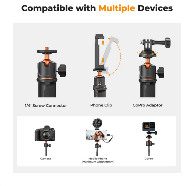 Stativ K&F MS11 je všestranné a lehké řešení určené pro uživatele mobilních telefonů a akčních kamer. Je vybaven svorkou pro mobilní telefon, která podporuje zařízení s maximální šířkou 91 mm, takže je ideální pro nahrávání videa a vysílání. Přiložený adaptér GoPro rozšiřuje jeho použití na akční kamery, jako jsou GoPro, DJI Osmo Action a zařízení Insta…