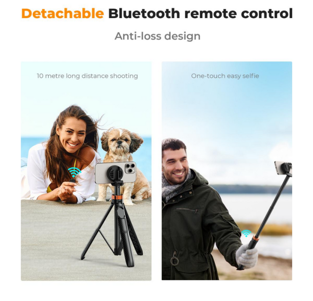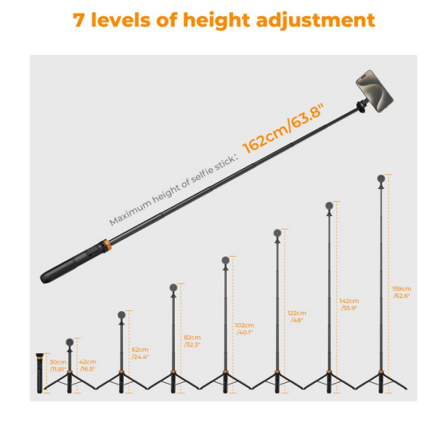 Stativ pro telefony K&F MS19 nabízí výjimečnou výškovou variabilitu s maximálním prodloužením 162 cm a 7sekčním nastavením nohou, což umožňuje nastavit ideální výšku pro jakýkoli záběr. Stativ je navržen pro pohodlné použití a je vybaven magnetickou instalační konstrukcí, díky níž je spojení mezi stativem selfie tyče a mobilním telefonem rychlé a bezproblémové. Tento stativ je kompatibilní s celou řadou zařízení, včetně modelů iPhone od 12 mini až po nejnovější 15 Pro Max. Magnetický držák zajišťuje komplexní pokrytí snímků, takže je ideální pro pořizování scenérií, portrétů nebo sportovních scén. Stativ integrovaný s dálkovým ovládáním Bluetooth usnadňuje bezproblémové pořizování selfie a fotografování na cestách a může se pochlubit ovládáním jedním tlačítkem a bezpečnou konstrukcí proti ztrátě s výdrží až 10 hodin nepřetržité práce. Rozšířená pevná konstrukce stativu a protiskluzové silikonové podložky ve spodní části zvyšují stabilitu, zatímco vestavěné gumové kroužky tlumící nárazy v trubce nohou zajišťují větší odolnost a stabilitu.