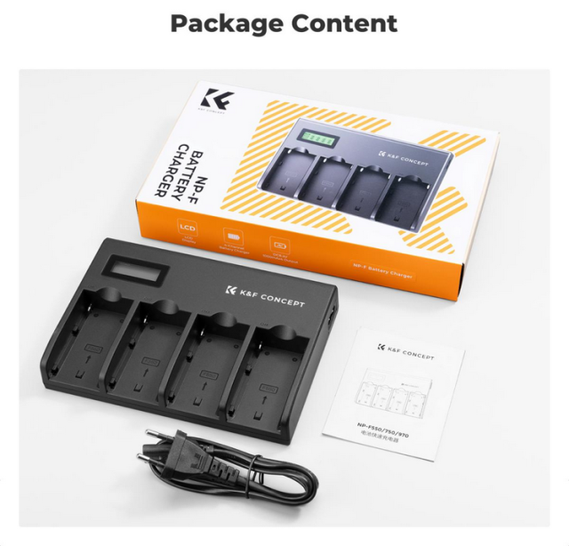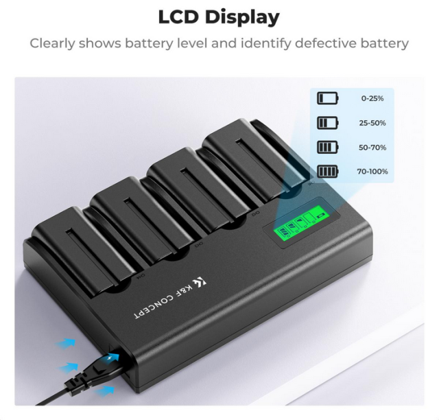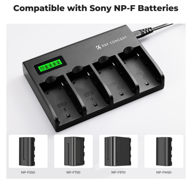 Čtyřkanálová nabíječka K&F NP-F nabízí inteligentní rychlé nabíjení baterií pro DV kamery Sony s LCD displejem pro zobrazení stavu baterie v reálném čase.