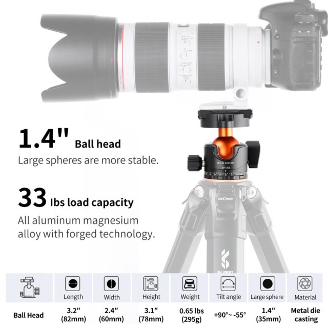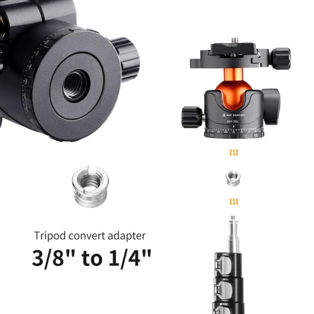 K&F Concept Professional 35mm kovový stativ s kulovou hlavou 15 kg/33 liber zatížení 360° otočný panoramatický stativ s 1/4" rychloupínací destičkou K&F Concept-35 Series. 2 knoflíky s kulovým šroubem - lze rychle ovládat přibližný rozsah +90° až -55°.