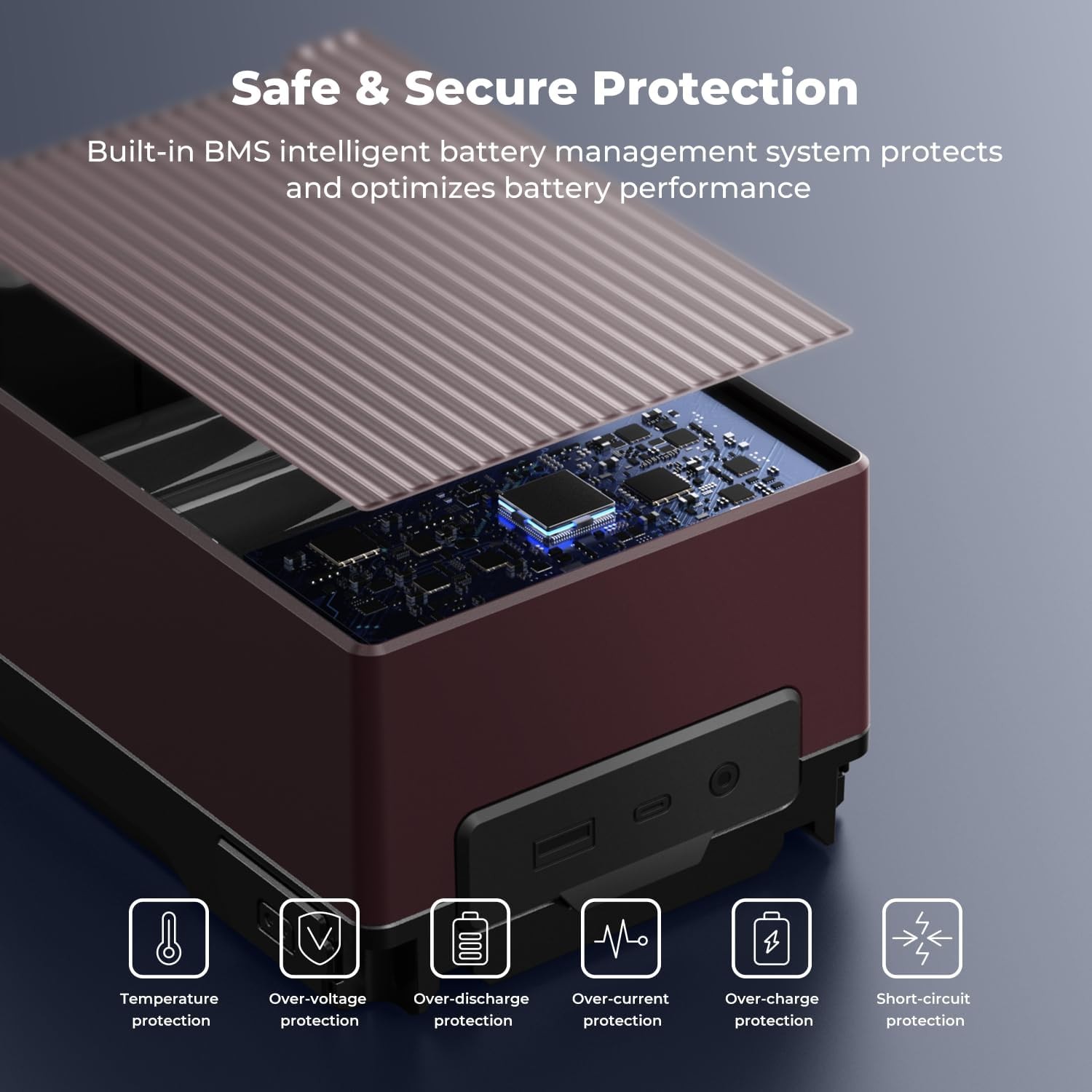 Bezpečná a spolehlivá: Baterie V Mount používá vysoce kvalitní značkové bateriové články, inteligentní systém BMS poskytuje několik úrovní ochrany, včetně ochrany proti nadproudu, zkratu, přehřátí a přepětí