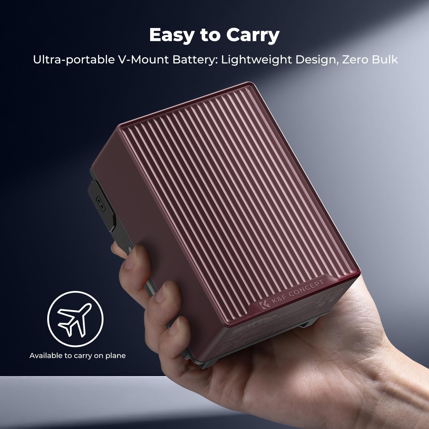 Přenosný design a vhodný pro leteckou přepravu: V-mount baterie o rozměrech 104*74*50 váží 525 g. Pouzdro je robustní a odolné proti nárazům, vyrobené z ohnivzdorného PC materiálu, který je odolný proti poškrábání a bezpečný pro použití. Vhodný pro leteckou přepravu, lze jej vzít na palubu