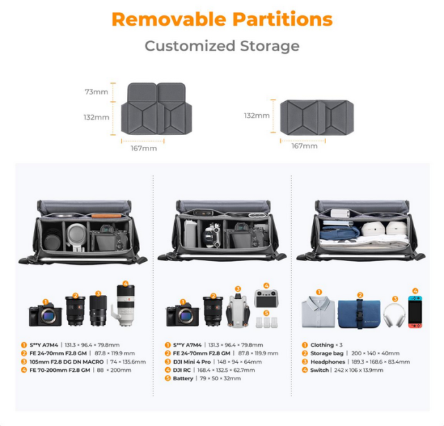 Brašna K&F Sling Bag 10L U10 je určena pro ty, kteří chtějí stylové a zároveň funkční řešení pro přenášení vybavení a příslušenství fotoaparátu. Tato brašna s moderním a elegantním designem je ideální pro profesionální fotografy i běžné uživatele. Prostorný hlavní oddíl obsahuje přizpůsobitelné přepážky, které vám umožní efektivně uspořádat vaše vybavení. Je ideální pro přenášení více těl fotoaparátů, objektivů a dalších nezbytností.
