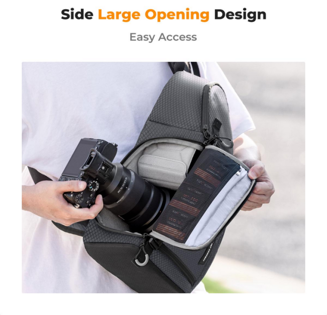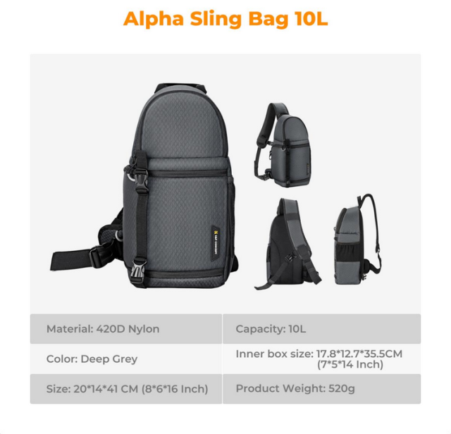 Brašna K&F Urban Wander 02 Sling Bag o objemu 10 l je promyšleně navržená brašna na fotoaparát, která kombinuje styl, praktičnost a ochranu. S rozměry 16 x 8 x 6 palců poskytuje dostatek úložného prostoru při zachování elegantního a kompaktního tvaru. Brašna je vybavena několika přihrádkami, které umožňují bezpečné uložení fotoaparátu, objektivů, stativu, příslušenství a osobních věcí.