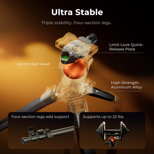 Kulová hlava má průměr 40 mm a unese zatížení až 10 kg. Nohy jsou vyrobeny z kvalitní hliníkové slitiny.