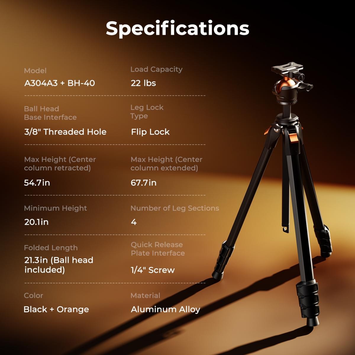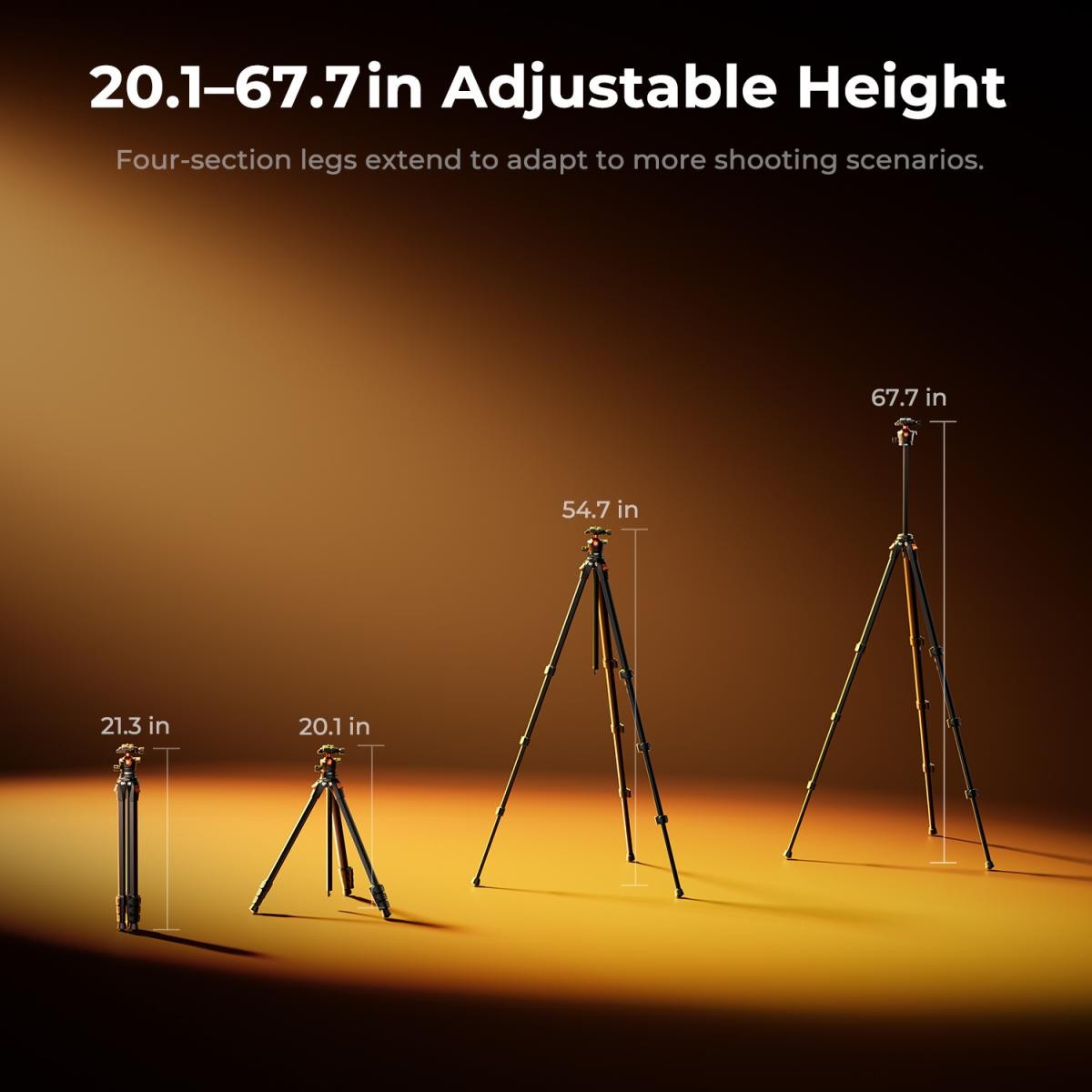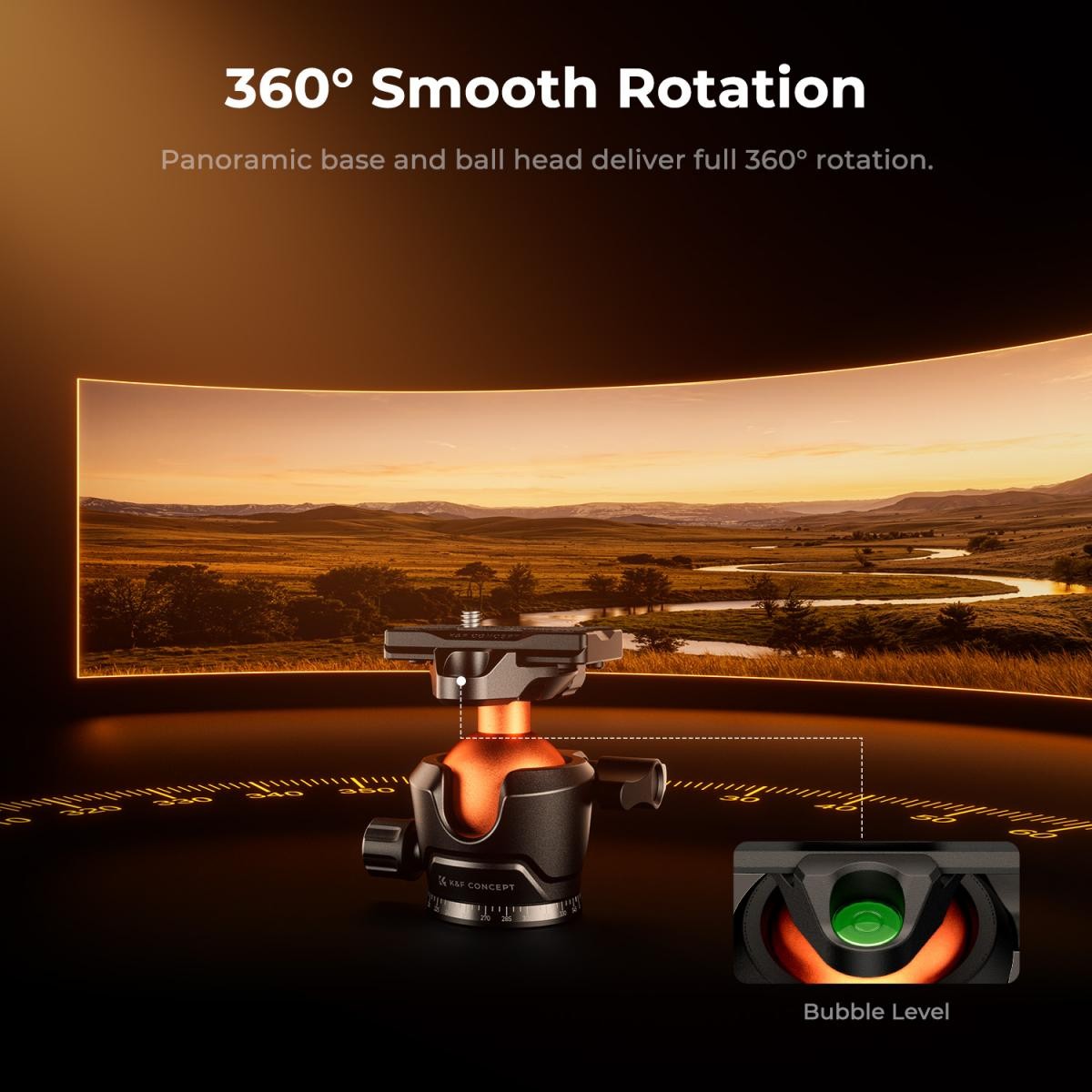 K&F tripod A304A3+BH-40 je 67" (172 cm) hliníkový cestovní stativ na fotoaparát s kulovou hlavou, který je kompatibilní se systémem Arca. Stativ je kompaktní, lehký a přenosný, vhodný pro DSLR, bezzrcadlovky, pozorovací dalekohledy, iPhone nebo teleprompter.