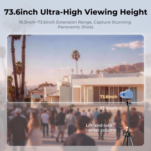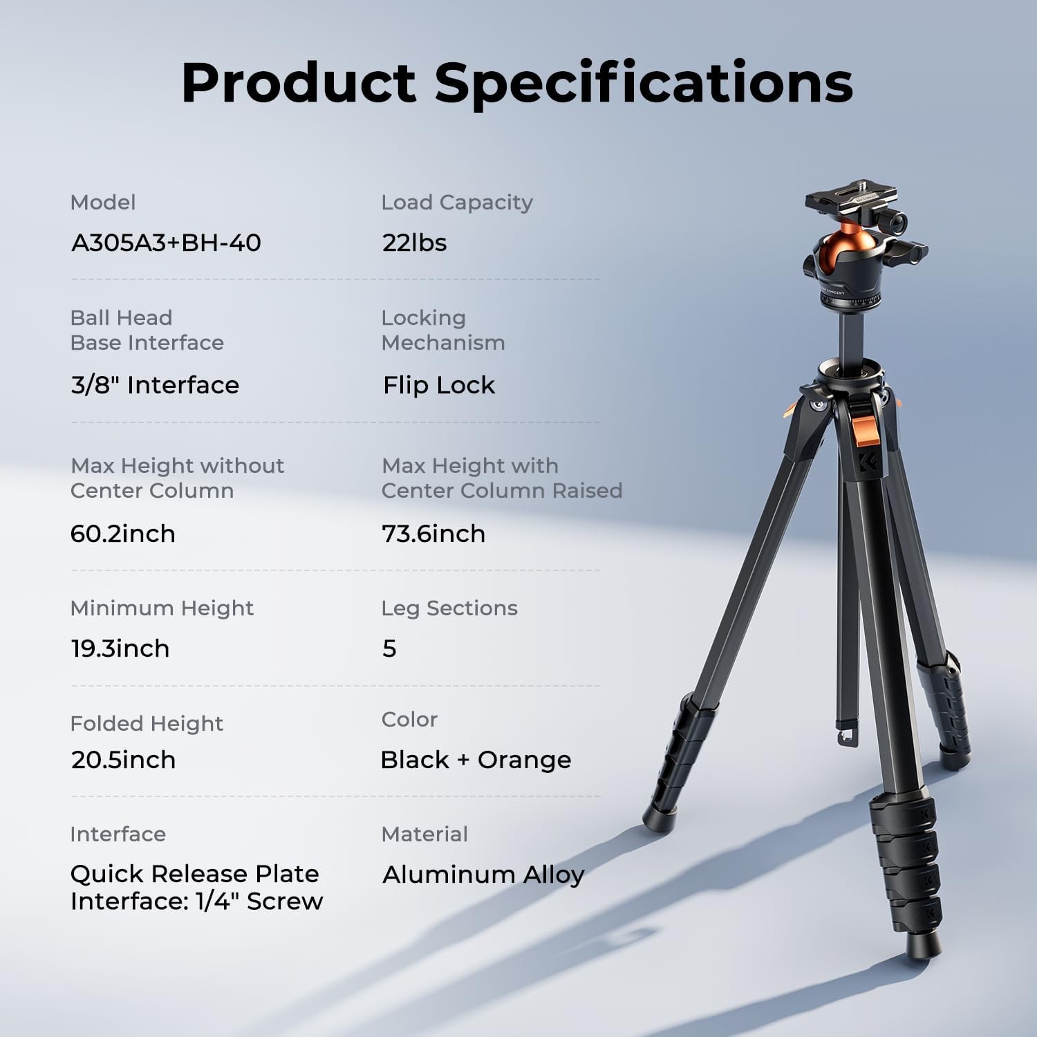 Stativ K&F Concept A305A3+BH-40 kombinuje pevnost a přenosnost v designu vhodném pro cestování. Je vyroben z odolné hliníkové slitiny a unese až 10 kg, takže je vhodný pro full-frame digitální zrcadlovky s teleobjektivy, bezzrcadlovky, smartphony a tablety. Díky nastavitelnému středovému sloupku nabízí stativ široký rozsah výšek od 48 cm do působivých 185 cm, což umožňuje pohodlné fotografování z různých úhlů a výšek.
