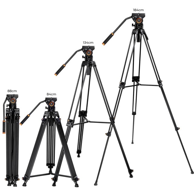 Multifunkční videostativ. S tímto odolným stativem stabilizujete svůj fotoaparát/kamkordér a pořídíte ostré fotografie a videa sportovních událostí, svateb, krajiny, lidí a výrobků. Maximální nosnost může být až 8 kg. Pomocí systému vyvážení a regulace tlumení může videohlava dosáhnout 360° otáčení a -70°/90° náklonu, což je vhodné pro panoramatické snímání, snímání shora dolů a snímání z nízkého úhlu. Odnímatelná rukojeť je vhodná pro použití levou i pravou rukou. Lze s ní prodloužit výšku stativu z 84 cm na 184 cm a zajistit ji pomocí výklopných zámků. Délka ve složeném stavu je 88 cm a k dispozici je brašna pro snadné skladování a přepravu.