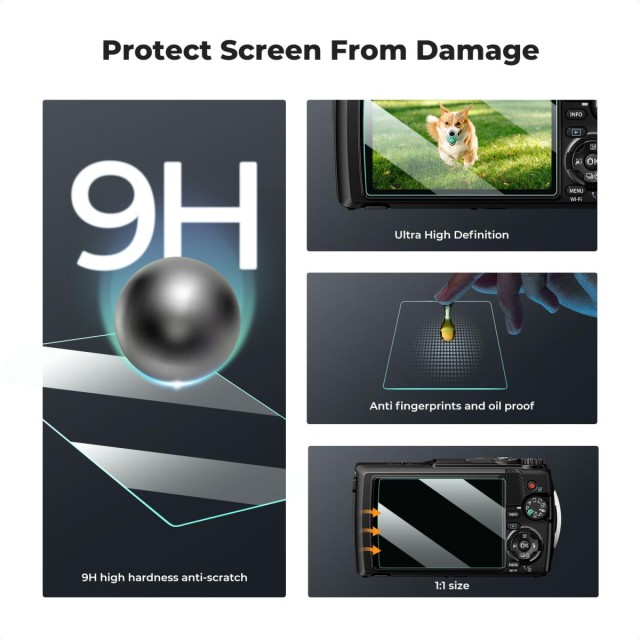 Vyrobeno z kvalitního tvrzeného skla s tvrdostí 9H, které poskytuje vynikající odolnost proti poškrábání a propíchnutí ostrými předměty – spolehlivě chrání displej vašeho fotoaparátu.