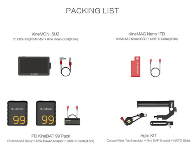 Balíček Kinefinity MAVO mark2 Agile Pack (A901-004-01) obsahuje dotykový displej KineMON 5U II 2000 nit, 1TB SSD KineMAG Nano, 2x PD KineBAT 99 (95 Wh V-mount s USB-C PD), duální nabíječku a karbonovou horní rukojeť – ideální sada pro majitele MAVO mark2 LF/S35.