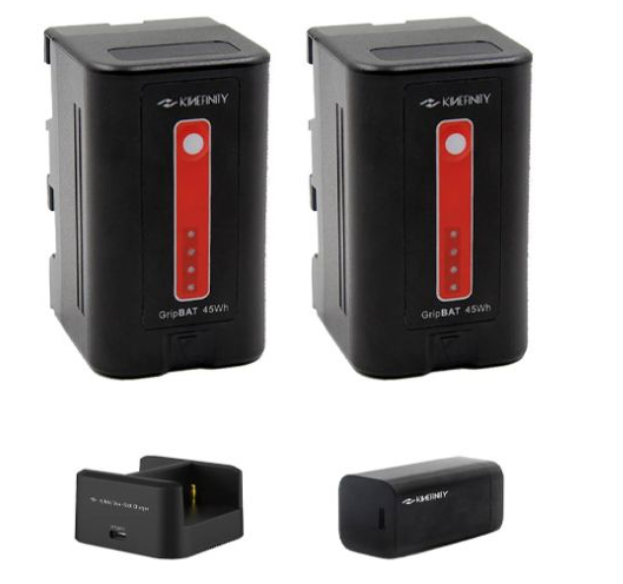 Balení Kinefinity A941-204-01 obsahuje 2x GripBAT 4S (52 Wh / 14,8 V kompatibilní s BP-U30, 70 W / 5 A) a hybridní duální nabíječku PD s 65 W adaptérem PD. Nabíjí dvě 52 Wh baterie na 80 % za 90 minut, funguje jako UPS, ideální pro ruční zařízení MAVO/TERRA.