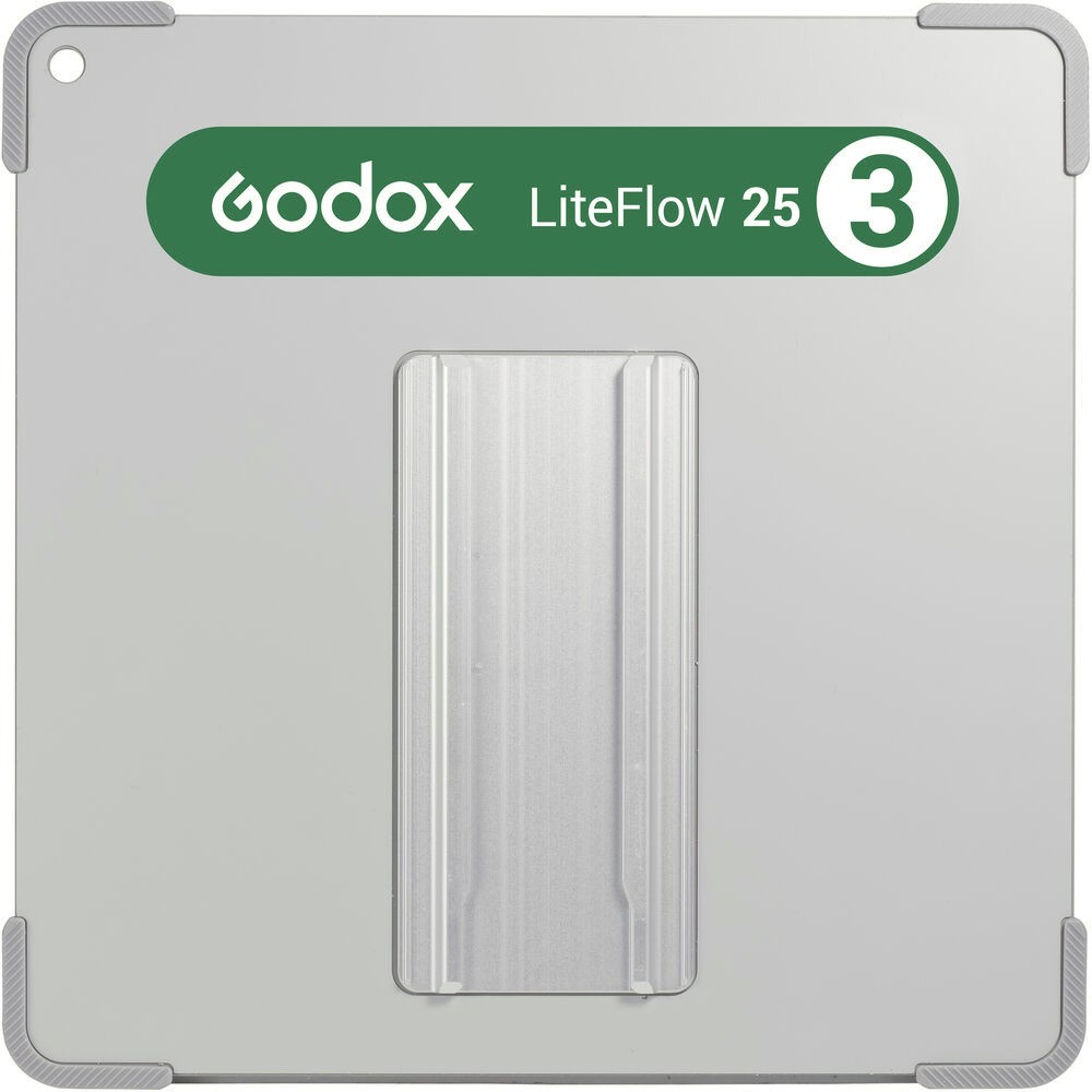 Godox Knowled LiteFlow 25-D3 (25 × 25 cm) je měkký stříbrný reflektor s hliníkovým povrchem, určený k vytváření rozptýleného doplňkového světla. Je lehký, barevně označený a integruje se do systému Cine Lighting Reflector od Godoxu pro univerzální a přesné filmové osvětlení.