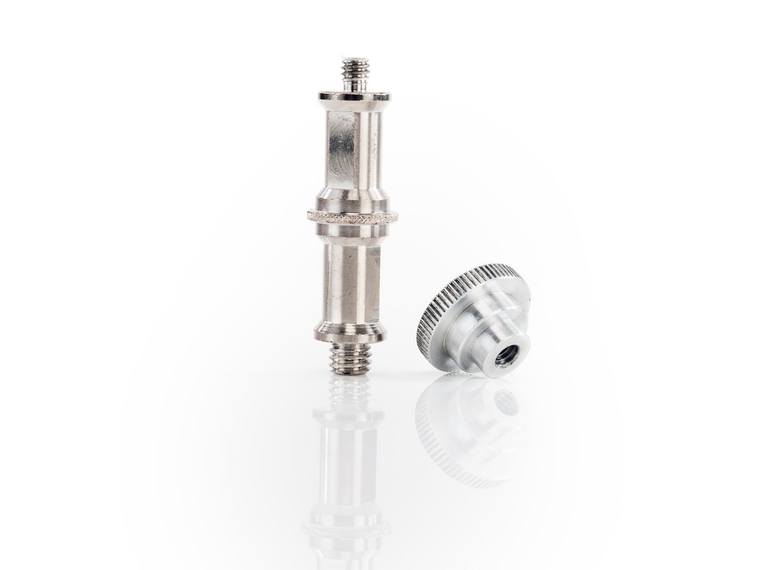 Spigot je vyroben z odolné kovové slitiny a má standardní montážní průměr 5/8" (16 mm) spolu se závitovými připojeními 1/4"-20 a 3/8"-16, což zajišťuje kompatibilitu s širokou škálou osvětlovacího vybavení a stativů. Součástí balení je rýhovaný zajišťovací knoflík, který zajišťuje pevné a bezpečné uchycení a zabraňuje nechtěnému pohybu během používání. Tento kompaktní a spolehlivý adaptér je ideální pro studiové i terénní fotografy, kteří vyžadují spolehlivé spojení mezi hlavami blesků a softboxovými modifikátory.