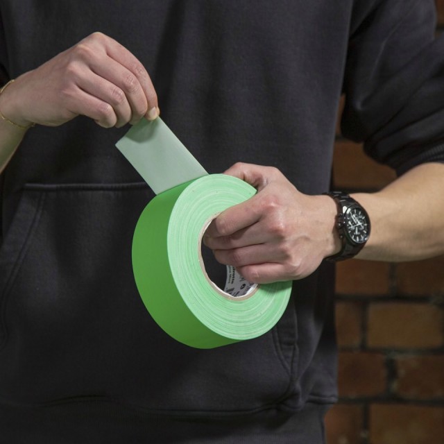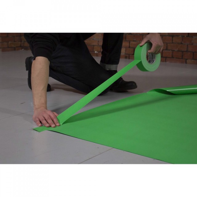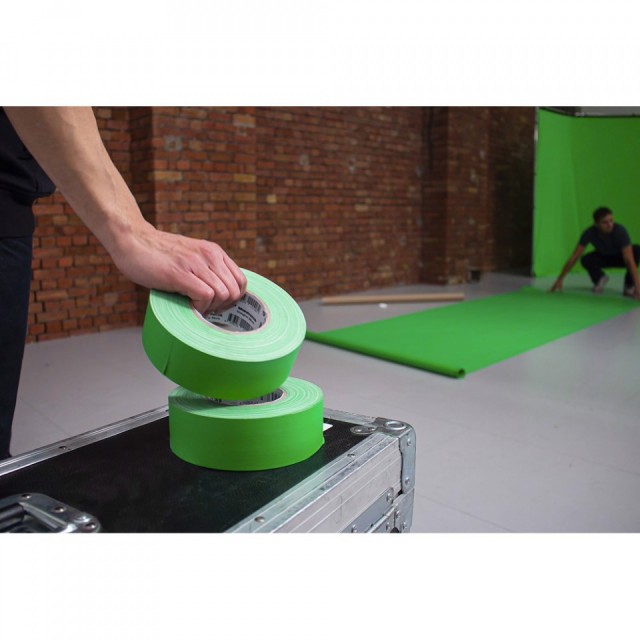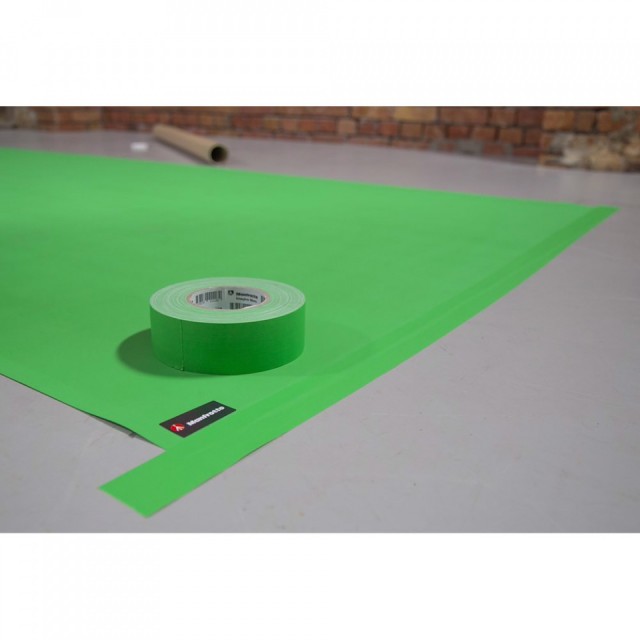 Páska Manfrotto Gaffer Tape 50 mm x 50 m Chroma Key Greenje ideální pro upevnění pozadí k podlaze a zakrytí spojů prohladké klíčovánípři použití vinylových podlahových řešení Manfrotto.