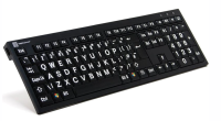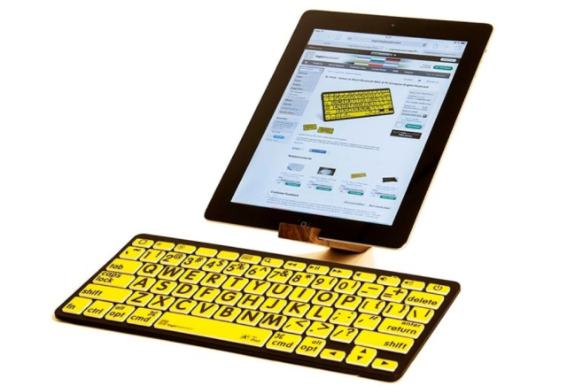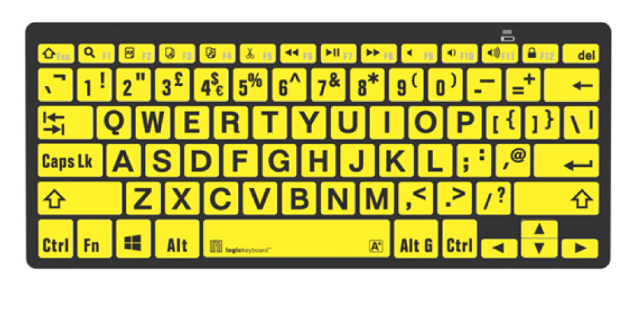 Bluetoothová klávesnice XLPrint v černé a žluté barvě pro britský rozložení kláves od společnosti Logickeyboard je první miniaturní Bluetooth klávesnicí s velkými znaky na trhu, která je určena pro uživatele se zrakovým postižením a seniory. Díky kontrastním černým písmenům na žlutém pozadí zlepšuje čitelnost, snižuje počet chyb při psaní a zmírňuje namáhání očí.
