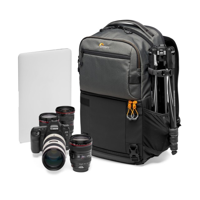 Šedý batoh Lowepro Fastpack Pro BP 250 AW III je všestranný batoh, který má dvě hlavní přihrádky, včetně foto přihrádky na spodní části batohu, která pojme DSLR nebo bezzrcadlovku se čtyřmi až pěti objektivy, včetně nasazeného objektivu.