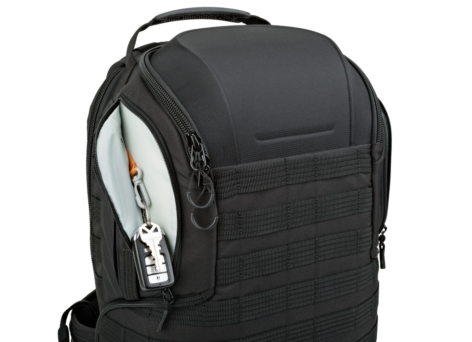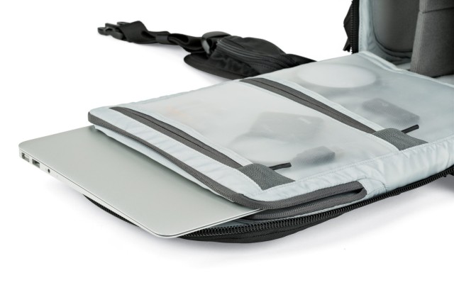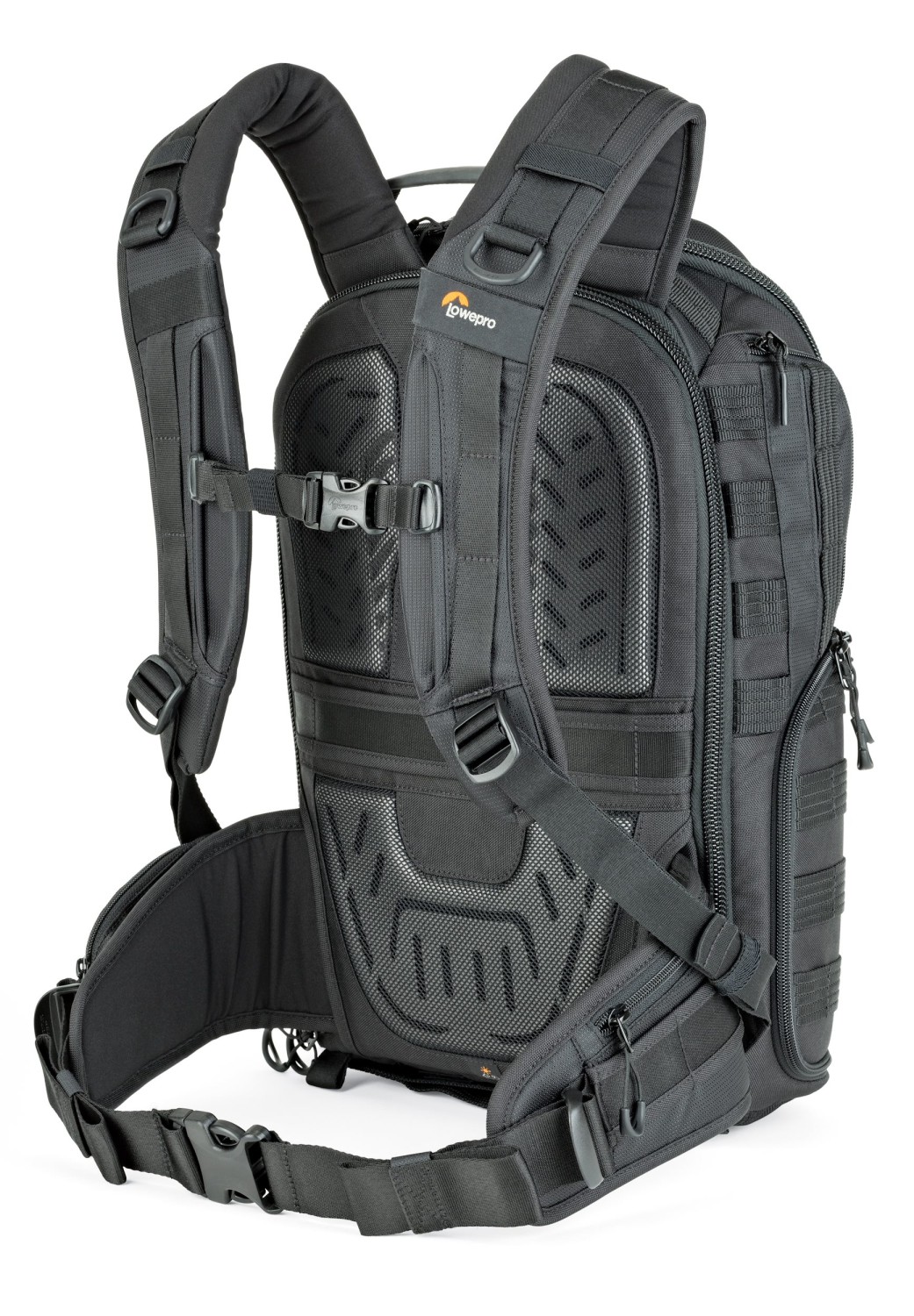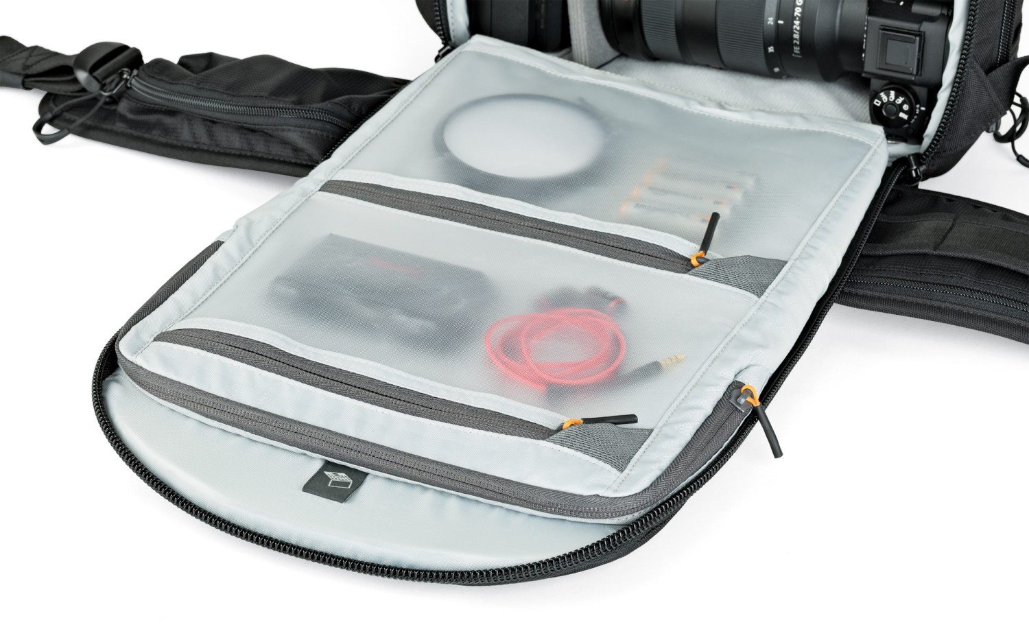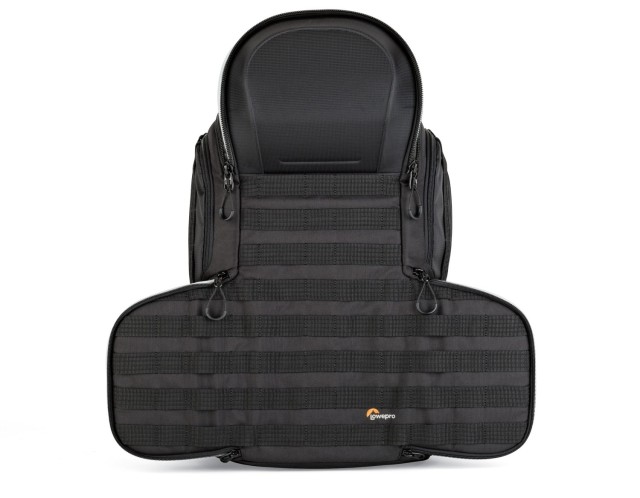 Díky čtyřem přístupovým bodům – hornímu otvoru, dvojitému bočnímu přístupu a zadnímu panelu – mohou fotografové okamžitě sáhnout po správném vybavení. Modulární systém popruhů SlipLock™ umožňuje neomezené přizpůsobení pomocí přiloženého příslušenství, jako je kapsa na láhev, pouzdro, úchyt na stativ a stahovací popruhy. Přizpůsobitelný bederní pás lze přeměnit na praktický opasek pro větší flexibilitu. Uvnitř chrání přihrádka CradleFit™ notebook až do velikosti 13 palců, zatímco přihrádka na fotoaparát pojme zrcadlovku s nasazeným objektivem 24–70 mm f/2,8, až šest objektivů nebo příslušenství, náhradní tělo fotoaparátu nebo dron DJI Mavic 2 Pro/Zoom.