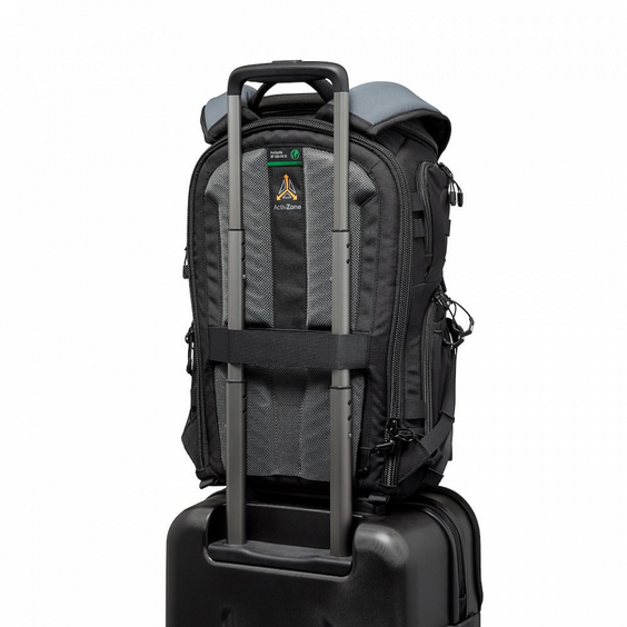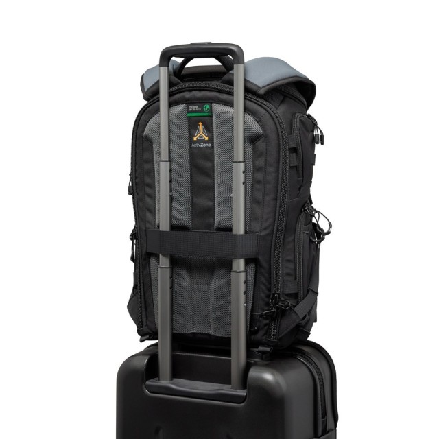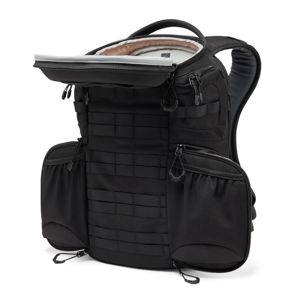 Uvnitř zadní strany se nachází zipové průhledné organizační přihrádky a kapsa CradleFit na notebook, která pojme až 14" MacBook Pro. Boční vstupy mají velké vnější pružné kapsy, které pojmou až 1L láhev, a jsou zpevněné na spodní straně pro podporu stativu. Další poutka a kapsy na horní části boků umožňují rychlý přístup k věcem a bezpečné připevnění stativu. Batoh stojí samostatně, což usnadňuje manipulaci a přístup k vybavení.