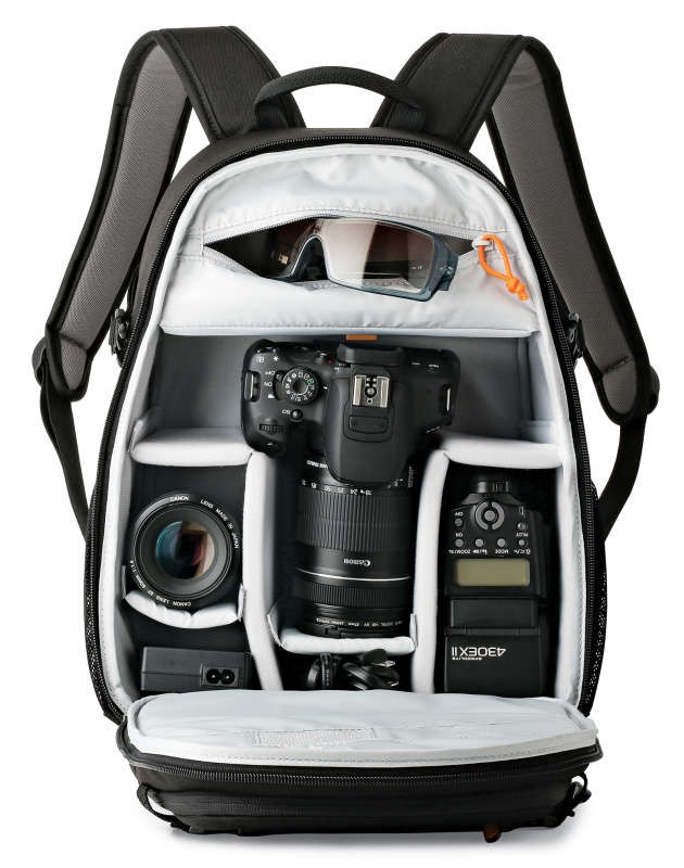 Prostorná hlavní přihrádka s dvojitým zipem obsahuje dvě velké a dvě malé polstrované nastavitelné přepážky, které chrání váš fotoaparát, 2 objektivy, blesk a další příslušenství, zatímco vnitřní kapsa na zip odděluje kabely a náhradní baterie.