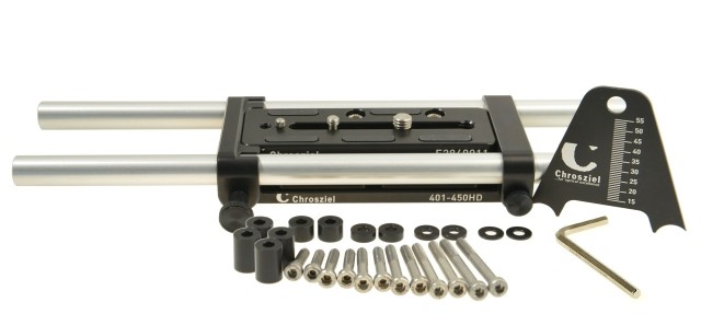 LWS - Light Weight Support 15 HD Allround, s tyčemi Ø 15 mm, délka 310 mm, dvojité vedení tyčí a svorka, nastavitelný pro všechny kamery s optickou výškou mezi 26,5 a 72,5 mm (vzdálenost mezi středem objektivu a spodní částí kamery). Součástí dodávky jsou distanční podložky (dvojice) 1, 2, 4, 8, 2 x 16 mm, sada šroubů, tabulka s výškami fotoaparátu a imbusový klíč. (Alternativně lze použít všechny kamerové platformy Chrosziel řady 401-4xx.)