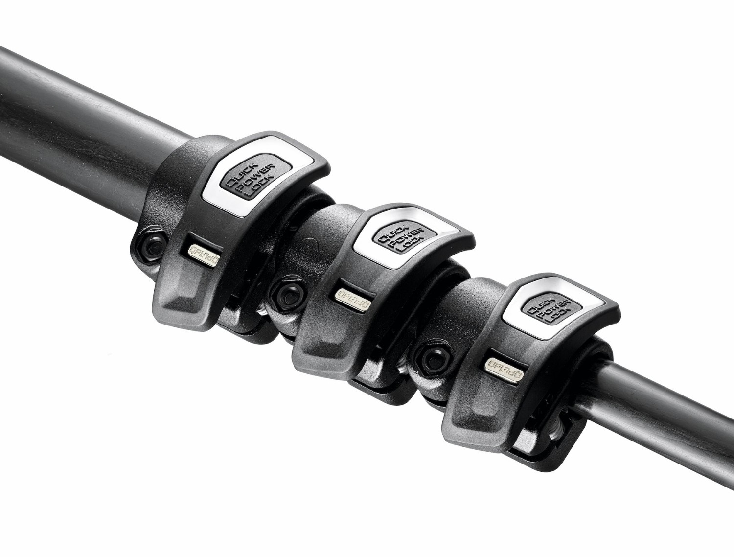 Nohy stativu 055XPRO4 jsou mimořádně pevné a snadno se nastavují a vysouvají pomocí systému Quick Power Lock. Tento robustní zajišťovací mechanismus blokuje nebo odblokovává jednotlivé části nohou, takže je lze otevřít jediným pohybem, a je vybaven ergonomickými voliči úhlu nohou pro maximální pevnost.