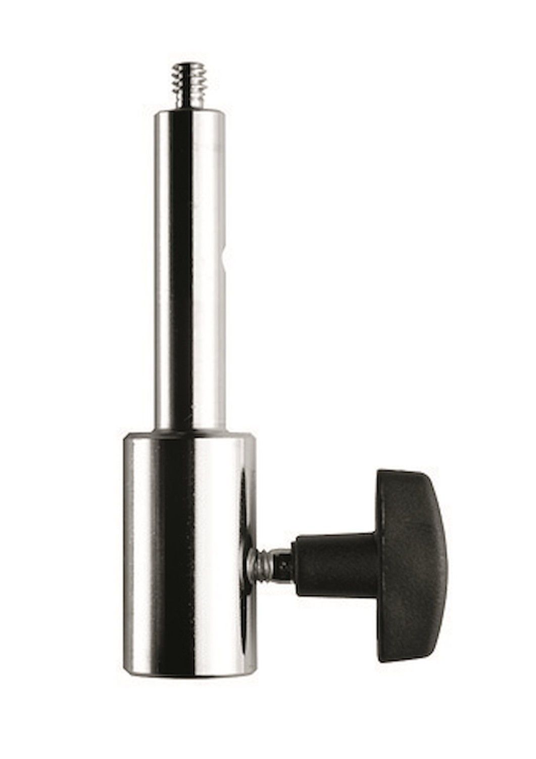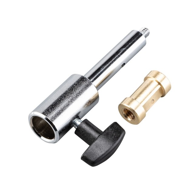 Manfrotto 016 je odolný ocelový adaptér s vnitřním závitem 16 mm (5/8″ Baby) a vnějším závitem 3/8″-16, speciálně navržený pro upevnění bleskových hlav Broncolor nebo jakéhokoli jiného světla s vnitřním závitem 16 mm na standardní čepy 3/8″ (Super Clamp, Magic Arm, stativové hlavy, ramena C-stand atd.). S hmotností 140 g a délkou 57 mm je to klasický adaptér, který najdete v každé profesionální osvětlovací sadě.