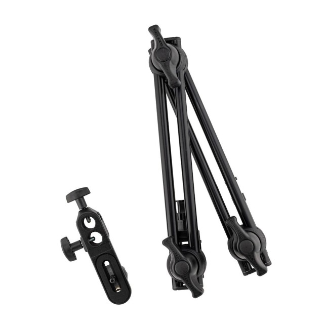 Manfrotto 396B-2 má dvě kloubové části s posuvným prodloužením, které se okamžitě zajistí pomocí ergonomických rychloupínacích pák, a dosahuje délky 62,5 cm pro přesné nastavení nad hlavou, z boku nebo z nízkého úhlu. Horní držák fotoaparátu obsahuje vnitřní závit 3/8"-16 a 16mm šroub, zatímco spodní čep kombinuje šestihranný protiskluzový profil (kompatibilní se Super Clamp) s univerzální 16mm kulatou částí pro stativy nebo svorky. Černý eloxovaný hliníkový rám s nosností 5 kg odolává ohýbání a opotřebení, což jej činí ideálním pro produktovou fotografii, video monitorování nebo práci s LED panely, blesky nebo malými kamerami – je kompaktní, pevný a nekonečně nastavitelný.