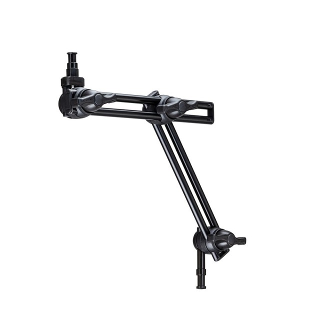 Manfrotto 396B-2 2-sekční dvojité kloubové rameno je 640 g černé hliníkové rameno s výsuvnou posuvnou částí (až 62,5 cm), nosností 5 kg, systémem rychlého uzamčení, držákem kamery s 3/8" vnitřním závitem + 5/8" vnějším závitem a protiskluzovým 16 mm šestihranným/univerzálním spodním čepem, který zajišťuje robustní a univerzální umístění světel, kamer nebo monitorů ve studiu nebo na místě.