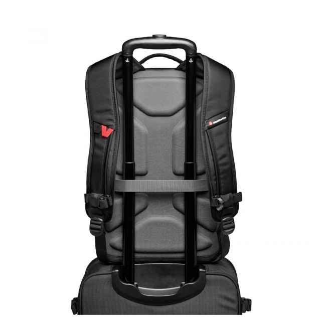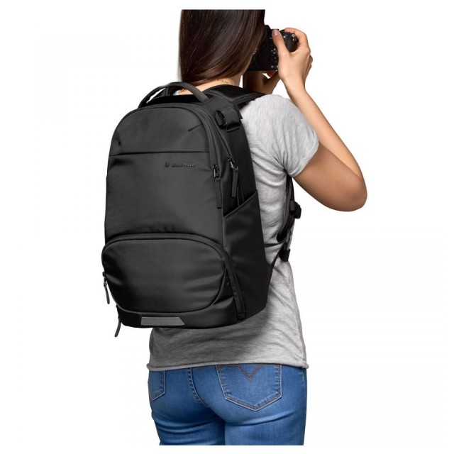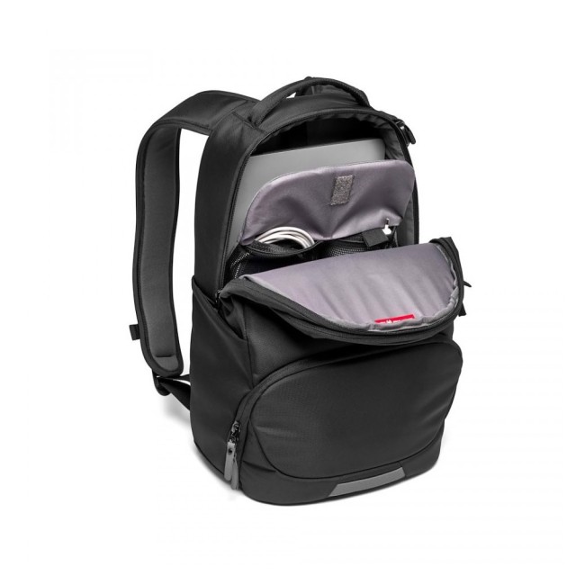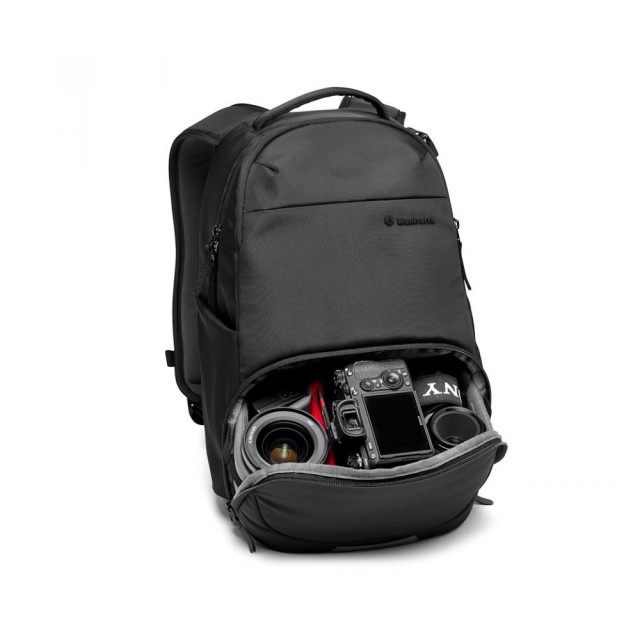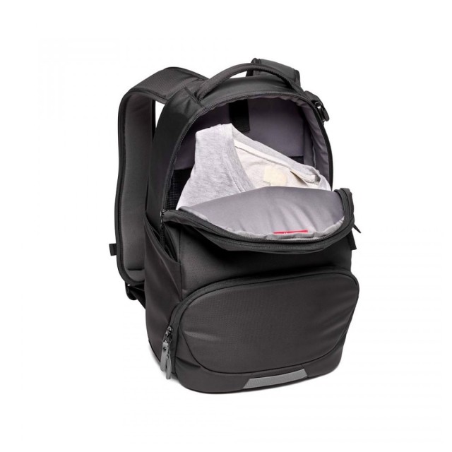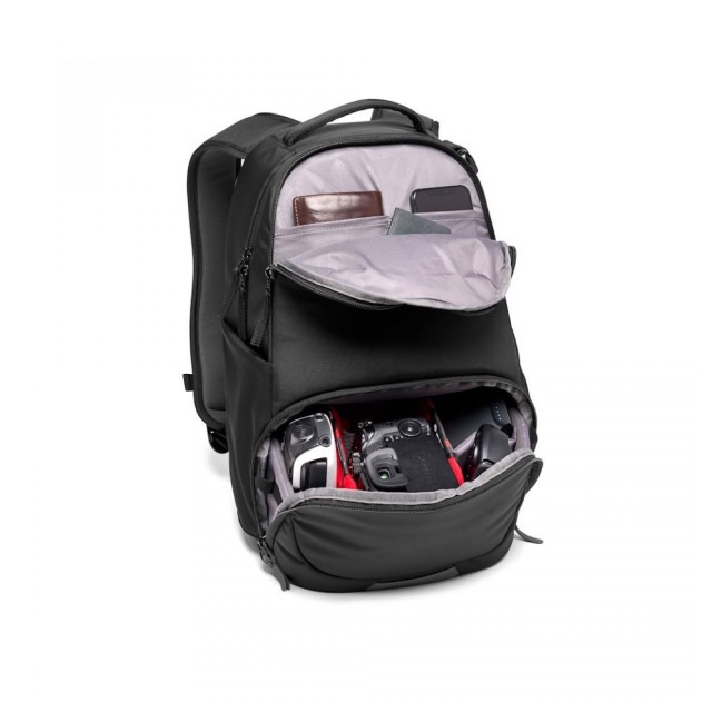 Jeho prostorný interiér pojme DSLR nebo bezzrcadlovku až se 3 objektivy. Polstrovaná přihrádka na fotoaparát je vybavena zcela novým ochranným systémem Manfrotto M-Guard™ Protection System, který je vyroben ze speciální pěny EVA s vysokou hustotou, která poskytuje výjimečnou absorpci nárazů při velmi tenkém profilu. Přizpůsobitelné skládací vzory umožňují maximální všestrannost pro plnou ochranu fotoaparátu a zároveň maximální využití prostoru. V horní přihrádce je dostatek místa pro osobní věci, včetně přihrádky na notebook, která pojme až 14" notebook.