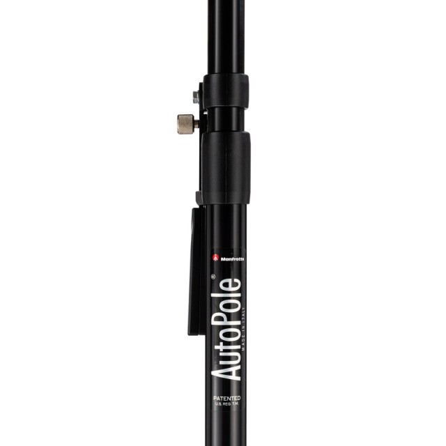Manfrotto 076B Autopole je černá, výsuvná hliníková tyč určená pro snadnou podporu pozadí v omezených prostorech, s rozsahem od 1,5 m do 2,7 m.