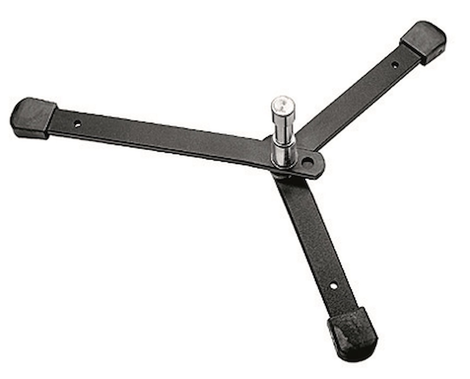 Mini stojan Manfrotto 003M Backlite je ocelový pavouk o hmotnosti 520 g, navržený pro pevnou oporu ve fixní výšce 9,7 cm. Tři obdélníkové nohy tvoří základnu o rozměrech 50 cm, každá s vyvrtaným otvorem pro přibití k podlaze, přišroubování ke zdi nebo připevnění ke stropu – ideální pro trvalé instalace ve studiu nebo focení na lokacích. 16mm (5/8") baby stud s bezpečnostním kolíkem unese až 10 kg, což je ideální pro malé fresnelovy reflektory, LED panely nebo okrajová světla. Jeho černý práškový nátěr odolává korozi, což z něj dělá ideální volbu pro filmové, fotografické nebo video štáby, které potřebují diskrétní, bezporuchové uchycení bez možnosti nastavení výšky.