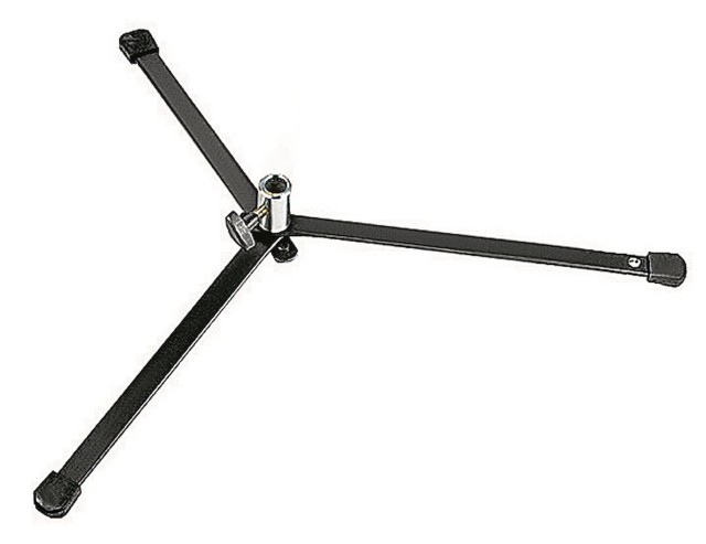 Manfrotto 003SPL Backlite Stand Base je 1 kg těžká černá ocelová mini pavoučí základna (bez sloupu a čepu) s pevnou výškou 9 cm, nosností 15 kg, třemi obdélníkovými sklopnými nohami, 3/8" zásuvkou a odnímatelným 1/4"-20 nebo 3/8"-16 konektorem – poskytuje ultra nízkou, pevnou podporu pro zadní osvětlení, kicker nebo světla na úrovni země.