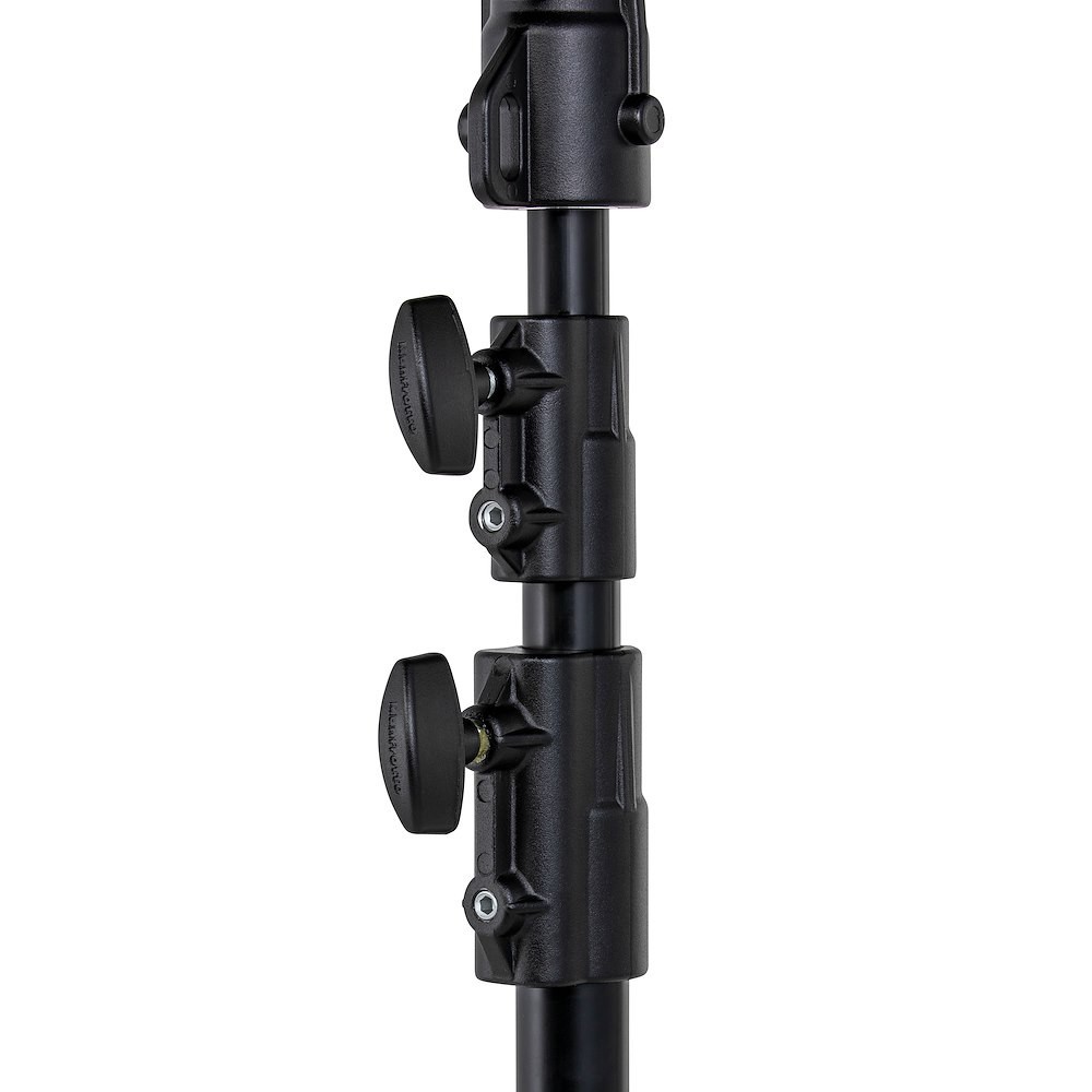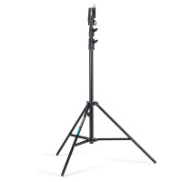 Manfrotto 298B Black Aluminium 3-Section Studio Stand je 6 kg vážící profesionální světelný stojan se sloupy ze stříbrného eloxovaného hliníku (35/30/25 mm), černou ocelovou skládací základnou na brzděných kolech, jednou vyrovnávací nohou a nosností 15 kg (5 kg při plném vysunutí na 300 cm) – poskytuje stabilní a mobilní podporu pro střední studiová světla, softboxy nebo nadhlavní rigy.