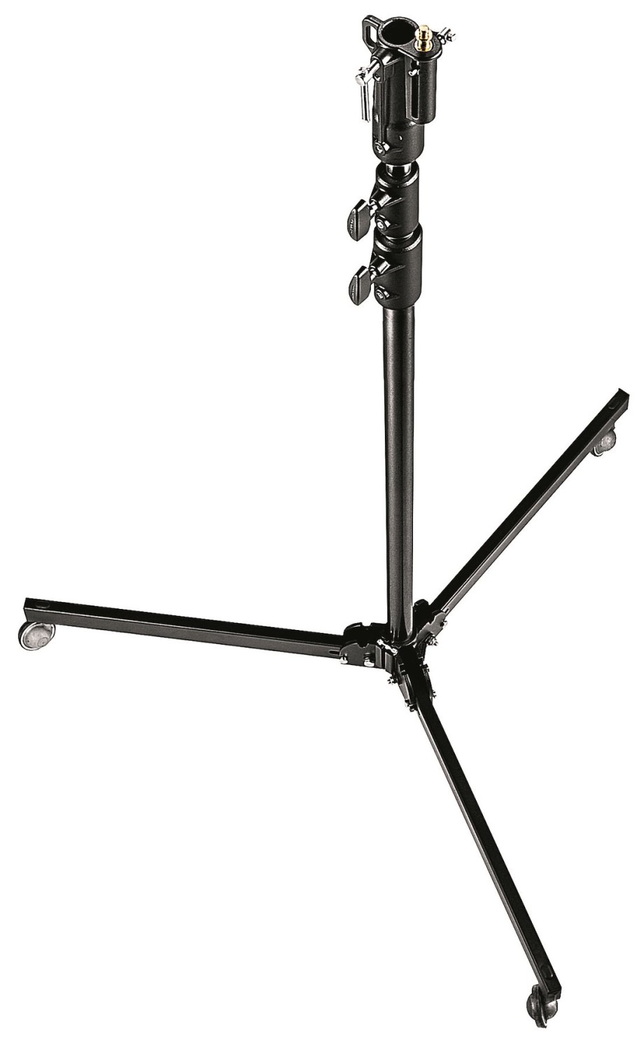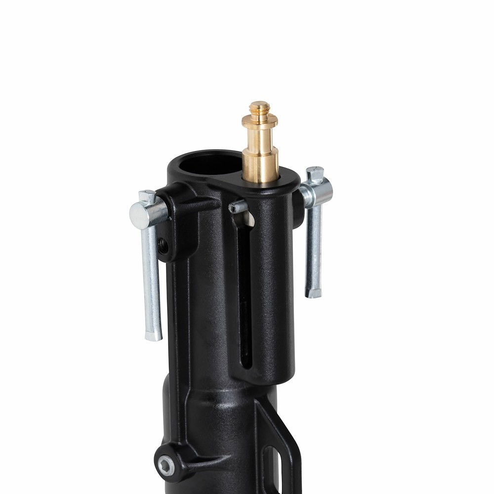 Manfrotto 298B kombinuje širokou černou ocelovou pavoučí základnu (se třemi uzamykatelnými kolečky a jednou nastavitelnou vyrovnávací nohou) a tři stříbrné hliníkové sekce, které se pomocí dvou výškových nástavců plynule vysouvají až na 300 cm. Obdélníkové ocelové nohy se pro přepravu sklopí do roviny, zatímco vyrovnávací noha kompenzuje nerovnosti podlahy až do ±15°. Doplněno o odnímatelný 5/8" (16 mm) baby stud plus 3/8"-16 závit (1/4"-20 redukce k dispozici), je ideální pro portrétní studia, video studia nebo půjčovny, které potřebují stabilní stojan na kolečkách, který unese 15 kg v blízkosti nebo 5 kg v plné výšce – spolehlivá odolnost pro každodenní profesionální použití.