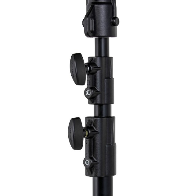 Manfrotto 298B Black Aluminium 3-Section Studio Stand je 6 kg vážící profesionální světelný stojan se sloupy ze stříbrného eloxovaného hliníku (35/30/25 mm), černou ocelovou skládací základnou na brzděných kolech, jednou vyrovnávací nohou a nosností 15 kg (5 kg při plném vysunutí na 300 cm) – poskytuje stabilní a mobilní podporu pro střední studiová…
