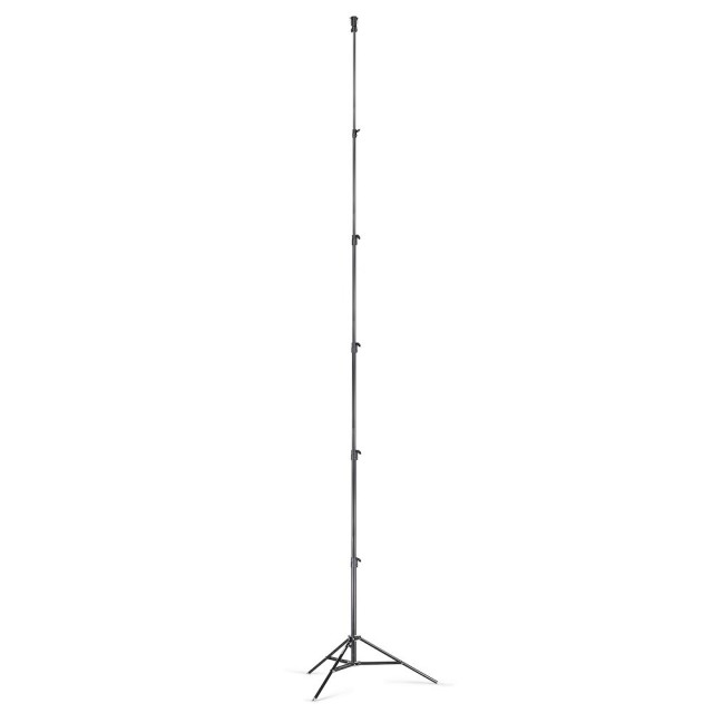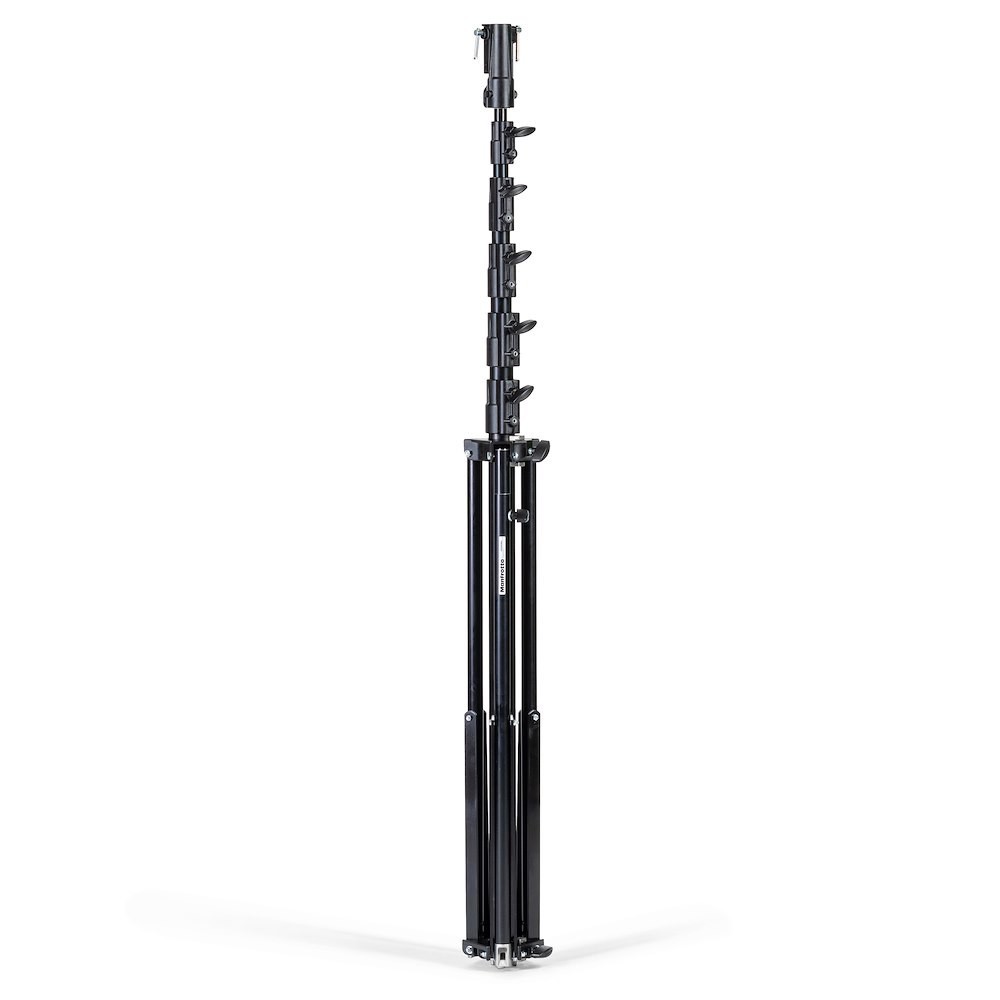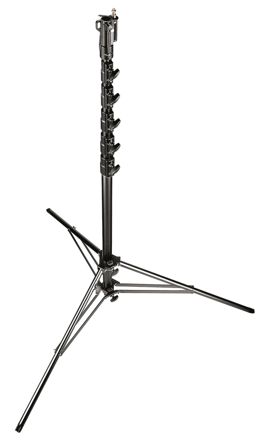 Manfrotto 269HDBU Black Aluminum Super High Stand je nejvyšší světelný stojan na světě připravený k produkci: pevný, dvojitě vyztužený 7,3 m (24 ft) černý hliníkový kolos se 6 sekcemi, nosností 10 kg, jednou vyrovnávací nohou a univerzální hlavou typu 14 (28 mm objímka + 16 mm čep + 3/8″ šroub). Ideální pro snímky z nadhlavní perspektivy, velké softboxy a high key/rim světla ve velkých studiích nebo na lokacích, kde potřebujete dosáhnout neuvěřitelné výšky, aniž byste si museli pronajímat výškovou plošinu.