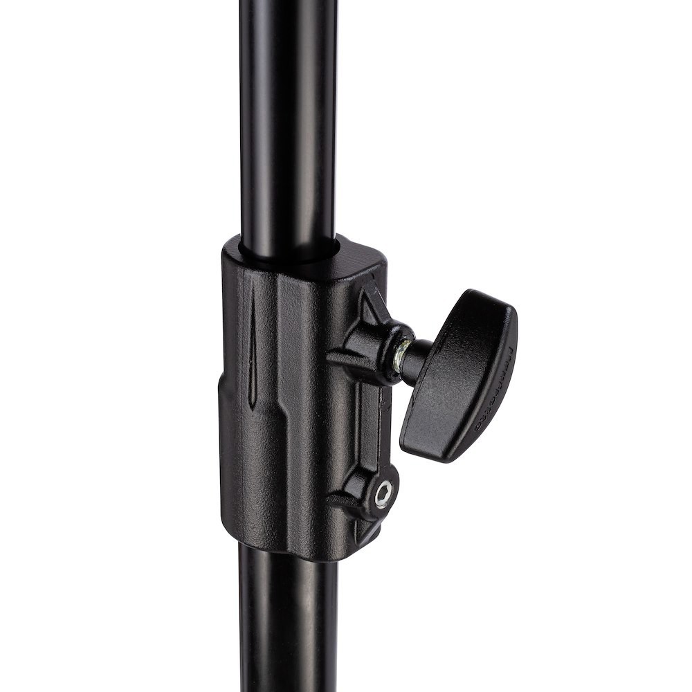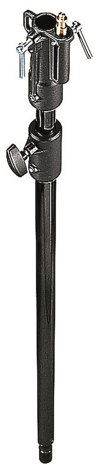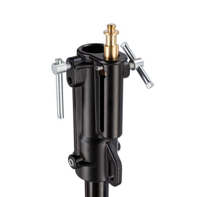Manfrotto 142B je černá verze legendárního robustního prodloužení stojanu Manfrotto. Dvě silné hliníkové části (jedna vzpěra) s velkými uzamykacími objímkami poskytují maximální výšku 210 cm a zároveň unesou plné studiovné zatížení. Spodní část je 28 mm (1-1/8″) junior samec, horní část je 28 mm junior samice + 16 mm baby čep + 3/8″ závit. Pokud potřebujete 12×12 rám, velký HMI nebo softbox vyšší, než na který dosáhne váš navíjecí nebo C-stativ, stačí nasadit 142B na vrch a máte hotovo.