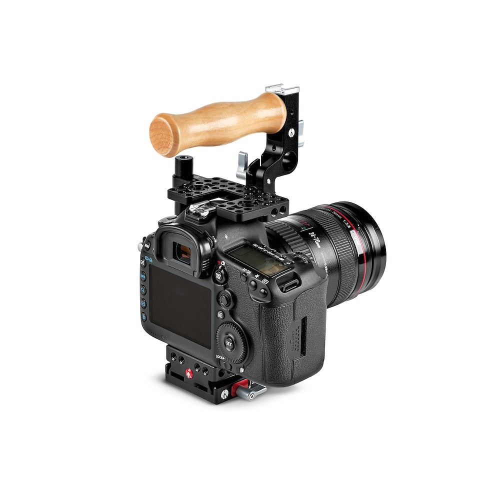 Manfrotto MVCCM Medium Camera Cage je lehká, výškově nastavitelná hliníková konstrukce pro středně velké digitální zrcadlovky a bezzrcadlovky (řady Canon 5D/6D/7D/80D, Nikon D500/D750/D850 atd.). Nabízí několik 1/4″ a 3/8″ závitů, body proti otáčení podle standardu Arri a Manfrotto, otočnou/sklopnou horní rukojeť, kterou lze přeměnit na boční rukojeť, vestavěnou studené patici, 15mm svorku na tyč a přiloženou svorku na kabel HDMI – díky tomu se váš fotoaparát promění v plně vybavený video/hybridní držák, který váží pouze 540 g.