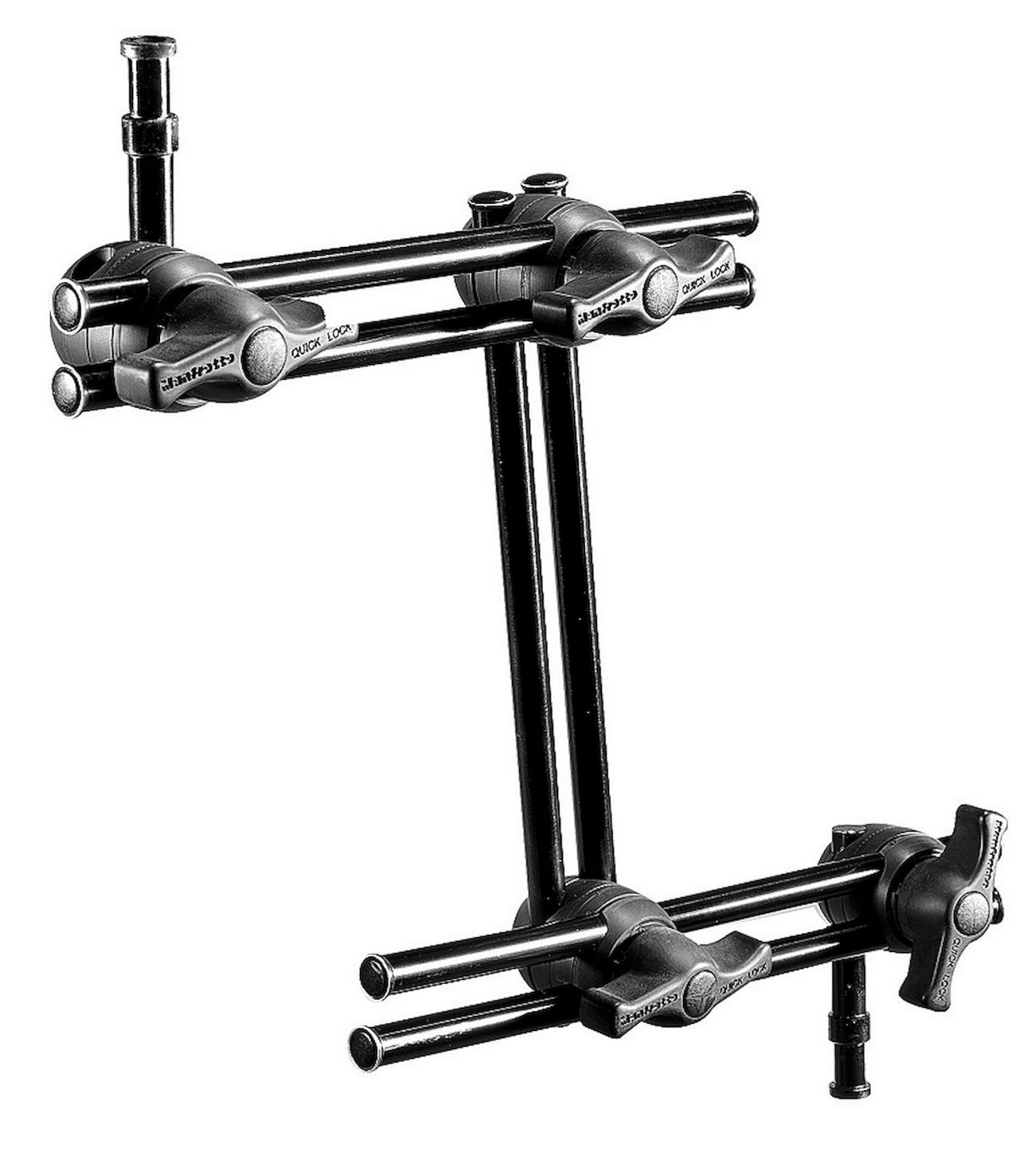 Manfrotto 396AB-3 je robustní třídílné černé hliníkové dvojité kloubové rameno (maximální dosah 860 mm, nosnost 4,5 kg, hmotnost 790 g) s rychloupínacími pákami, výsuvnou středovou částí, 16mm šestihranným/univerzálním spodním čepem (kompatibilním se Super Clamp) a horním 5/8" čepem + 3/8" vnitřním závitem – poskytuje vynikající pevnost a univerzálnost…