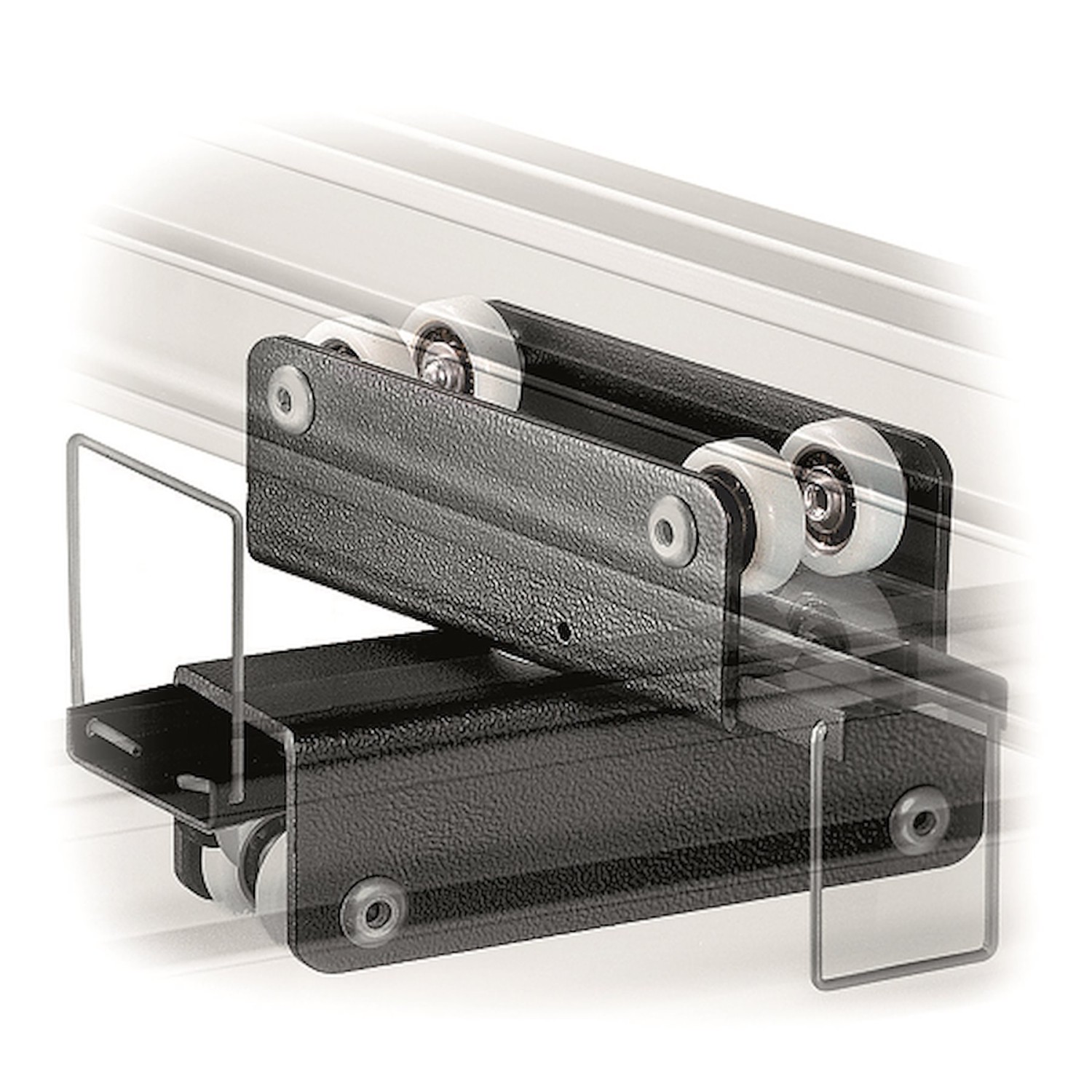 Tento dvojitý vozík je vybaven dvěma nezávislými brzdovými systémy. Horní brzda pevně zajišťuje vozík k pevné kolejnici a zabraňuje nežádoucímu pohybu během provozu. Spodní brzda vozíku mezitím blokuje posuvný pohyb pohyblivé kolejnice a zajišťuje přesné polohování a kontrolované nastavení. Tato konfigurace s dvojitou brzdou je ideální pro studia, kde je rozhodující přesnost, opakovatelnost a bezpečnost.