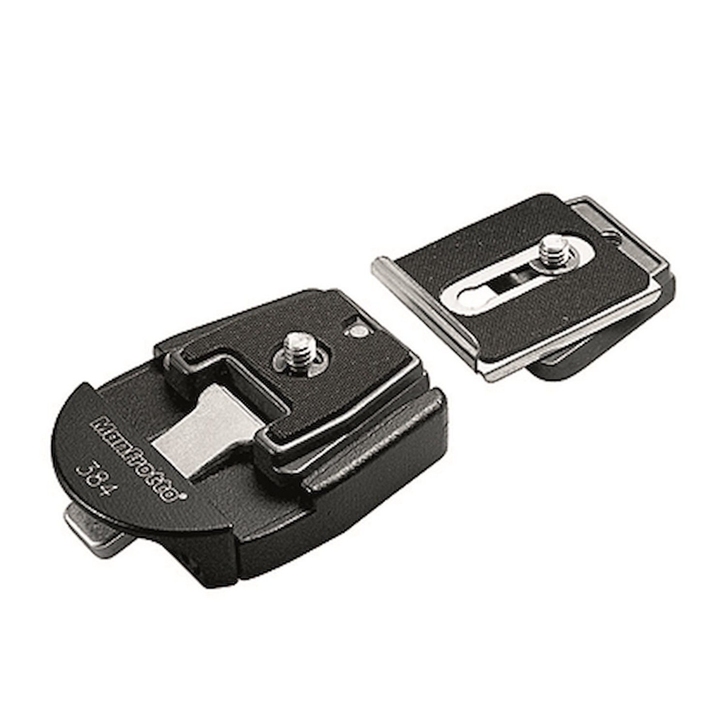 Adaptér Manfrotto 384 Dove Tail Plate je 170 g hliníkový systém rychlého uvolnění s designem rybiny, včetně desek 384PL a 384PLARCH a upevňovacích šroubů 1/4"-20 a 3/8"-16, který umožňuje rychlou a bezpečnou výměnu fotoaparátu pro architektonické nebo makro zařízení na kompatibilních hlavách Manfrotto.