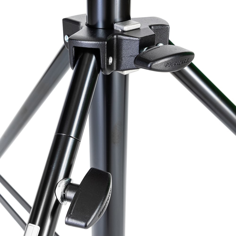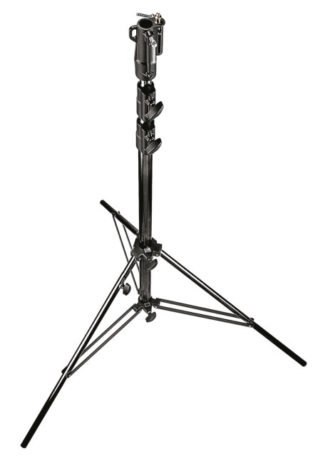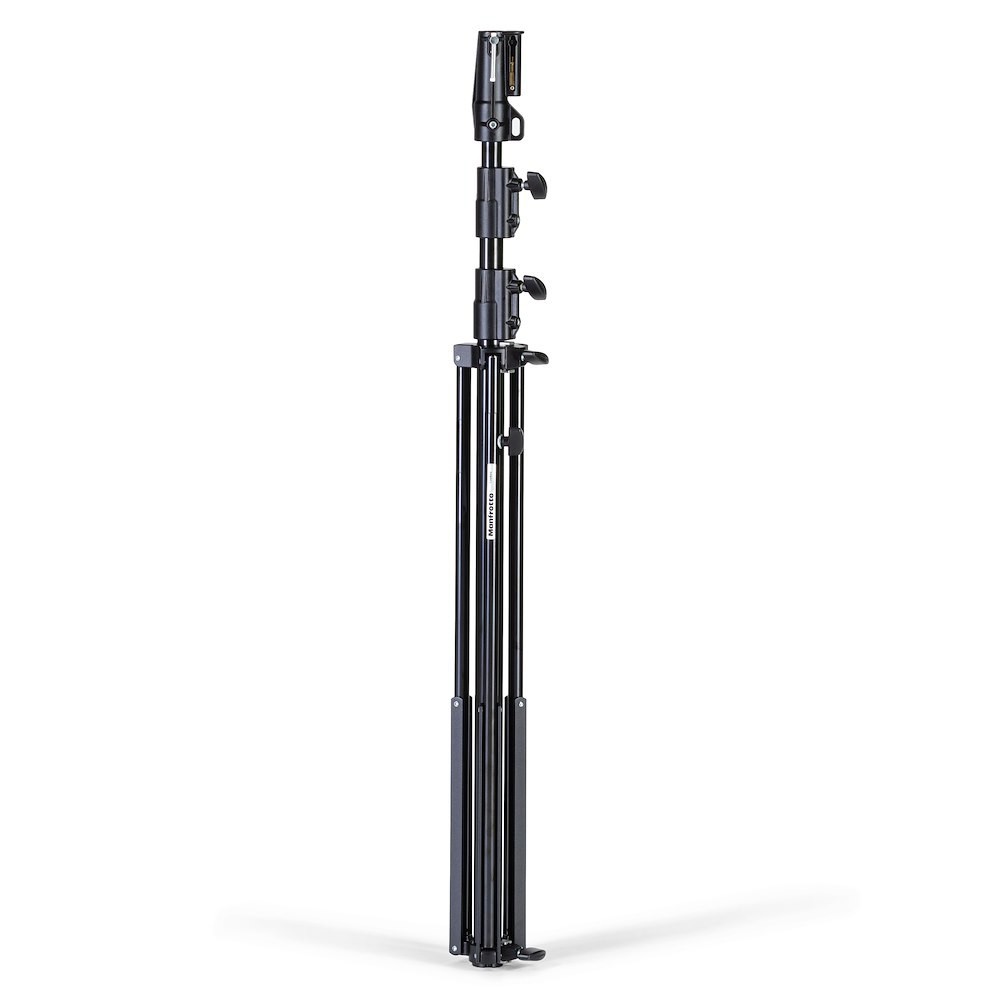 Manfrotto 126BSU Black Steel Heavy Duty Stand je 8,3 kg těžký, 3dílný junior stojan s výškou 131–333 cm a nosností 40 kg (3 kg při maximálním vysunutí), dvojitě vyztuženými nohami, vyrovnávací nohou, univerzální 28mm objímkou + 16mm čepem + 3/8" šroubovou hlavou a doporučenými kolečky (109/110/110G) – poskytuje pevnou a připravenou podporu pro velké HMI, LED nebo boom rigy.