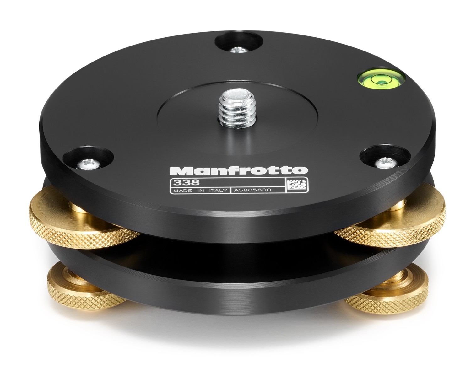 Vyrovnávací základna Manfrotto 338 umožňuje přesné vyrovnání fotoaparátu na stativech bez vestavěných vyrovnávacích mechanismů. Je vybavena třemi nastavovacími kolečky, pojistnými kroužky a vestavěnou vodováhou.