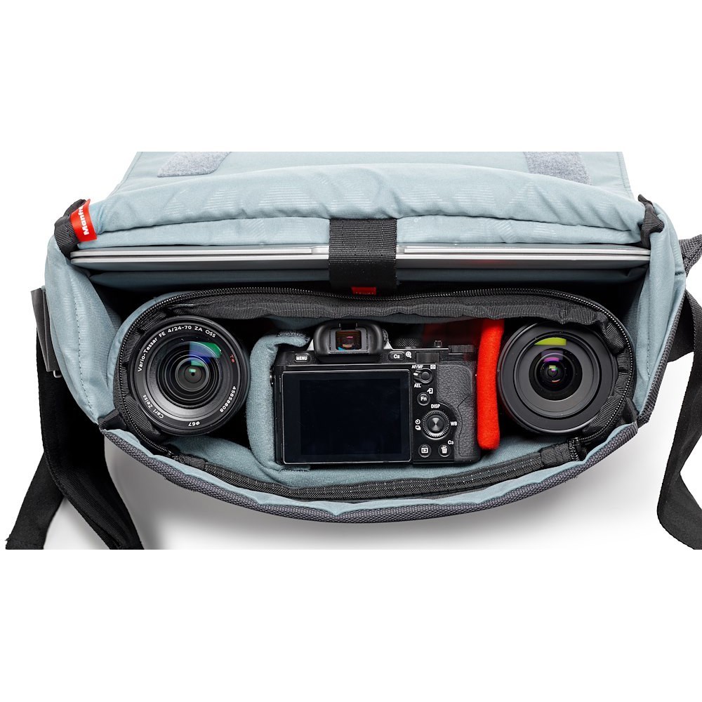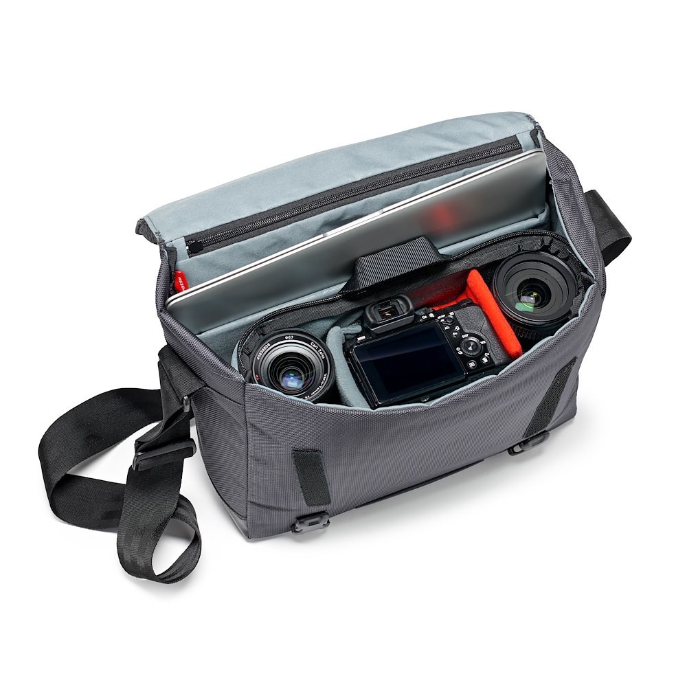 Manfrotto MB MN-M-SD-10 Manhattan Speedy-10 Messenger je 880 g šedá městská taška z balistického nylonu s odnímatelnou vložkou Flexy Camera Shell (26 × 10 × 19 cm), 12" pouzdrem na notebook, skrytou klopou na stativ, stabilizačním popruhem a vodoodpudivou povrchovou úpravou – vhodná pro prémiové CSC (A7II + 2 objektivy) nebo DJI Mavic sady pro každodenní…