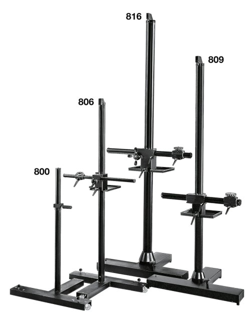 Vyvážený sloupek z černě eloxovaného hliníku je namontován na těžké litinové základně o rozměrech 84 x 55 cm se dvěma otočnými kolečky, která se pevně uzamykají pomocí jednotlivých zámků kol.