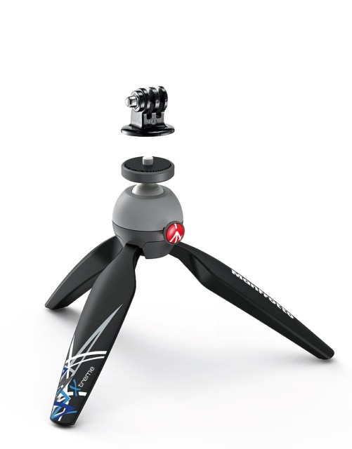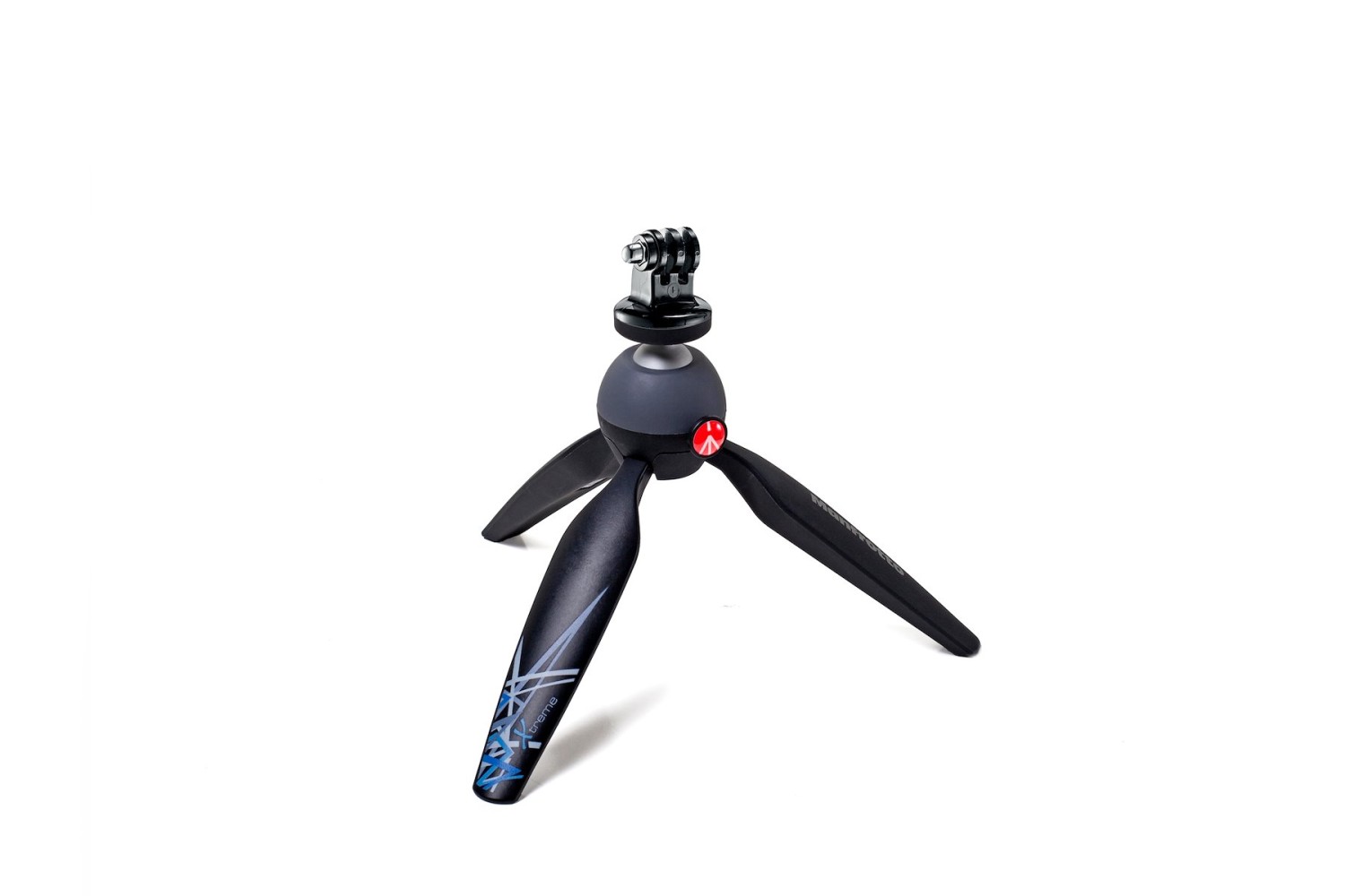 Stativ Manfrotto PIXI Xtreme Mini s adaptérem GoPro: Ultra přenosný stolní/ruční stativ o výšce 16 cm s tlačítkovou kulovou hlavou, šroubem 1/4"-20, gumovými nožičkami a speciálním držákem GoPro – unese 1 kg v balení z nerezové oceli/Adapto o hmotnosti 195 g.