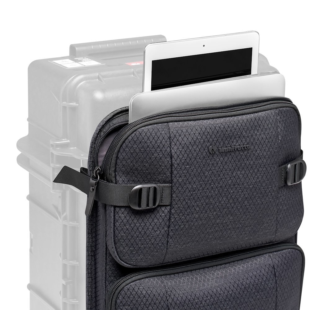 Přídavné pouzdro na notebook pro kufry Manfrotto Pro Light Tough. Snadné připevnění pomocí 4 (nebo 6, v závislosti na modelu) kovových spon. Vše zůstává na svém místě díky odolnému nastavitelnému popruhu. Určeno pro notebooky do 15". Do předních kapes lze přidat další příslušenství, jako jsou nabíječky, kabely a další. Toto pouzdro lze také použít jako samostatné pouzdro na notebook s přiloženým popruhem. Pouzdro je vyrobeno z vodoodpudivých materiálů.