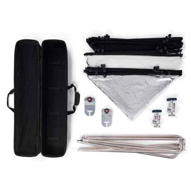 Snadno přenosný set pevného rámu s výměnnými látkami pro práci se světlem. Kvalitní lehký hliníkový rám umožňuje snadnou manipulaci. Univerzální využití pro foto i video.
